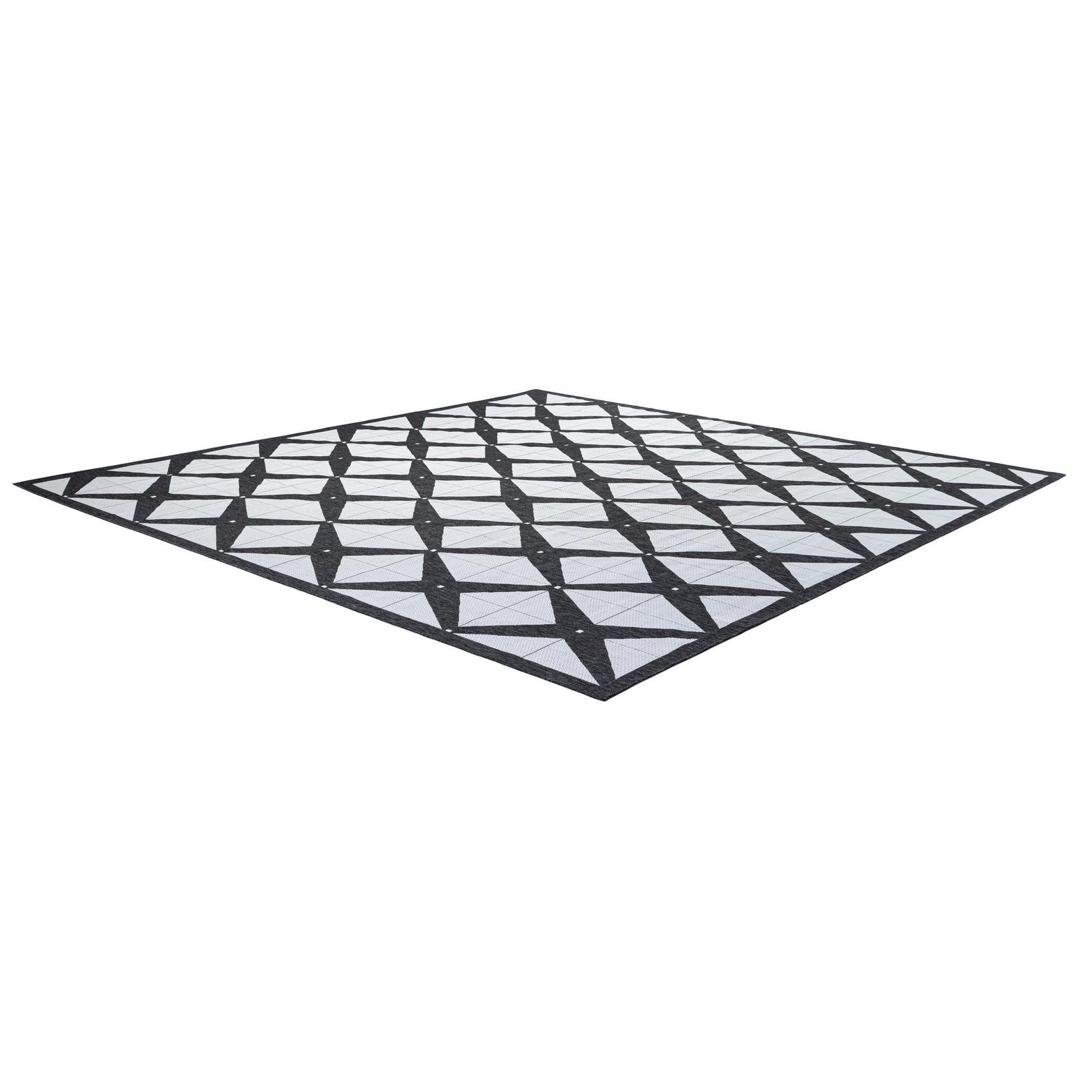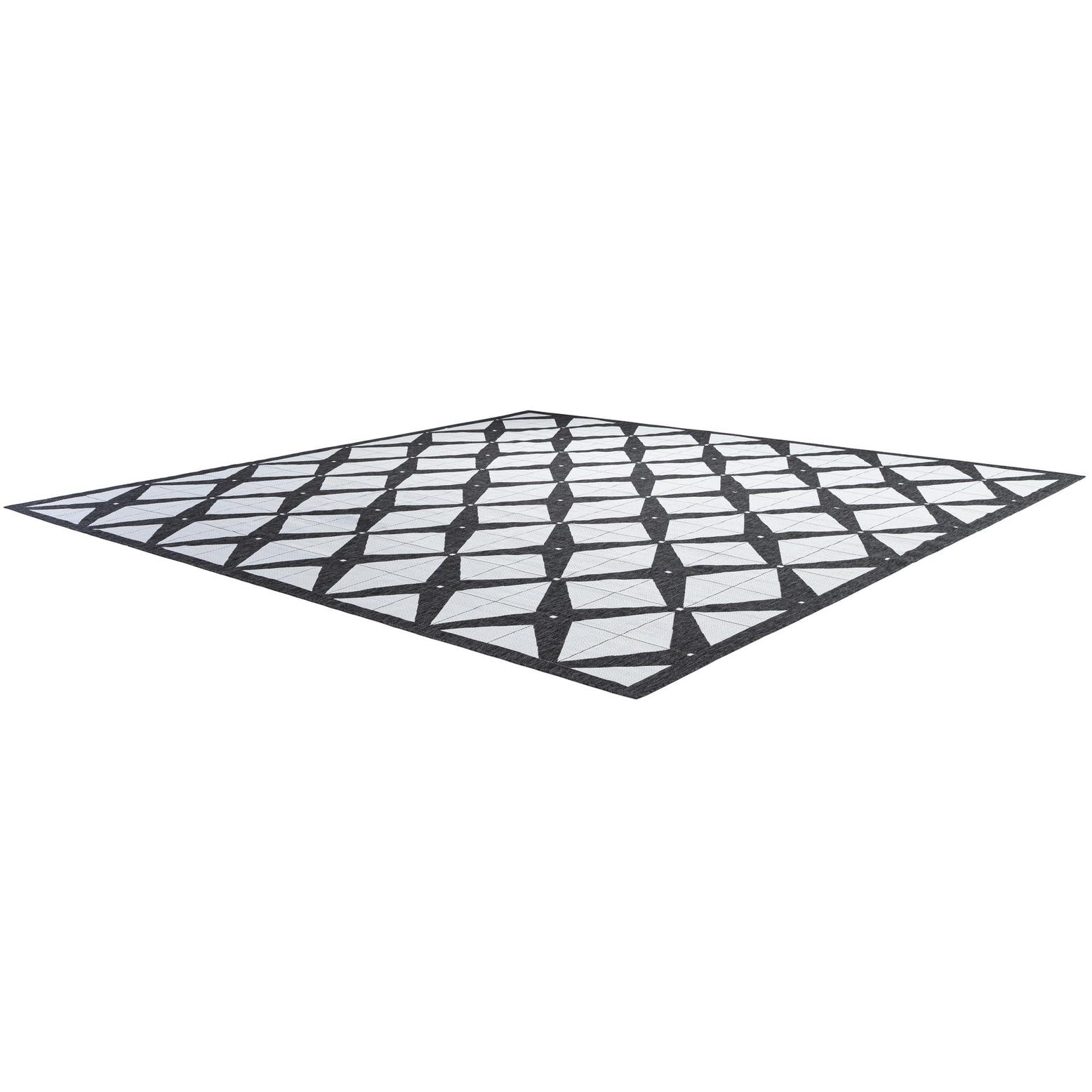 A 13' square black and white modern geometric outdoor rug with a repeating diamond pattern and thin border.