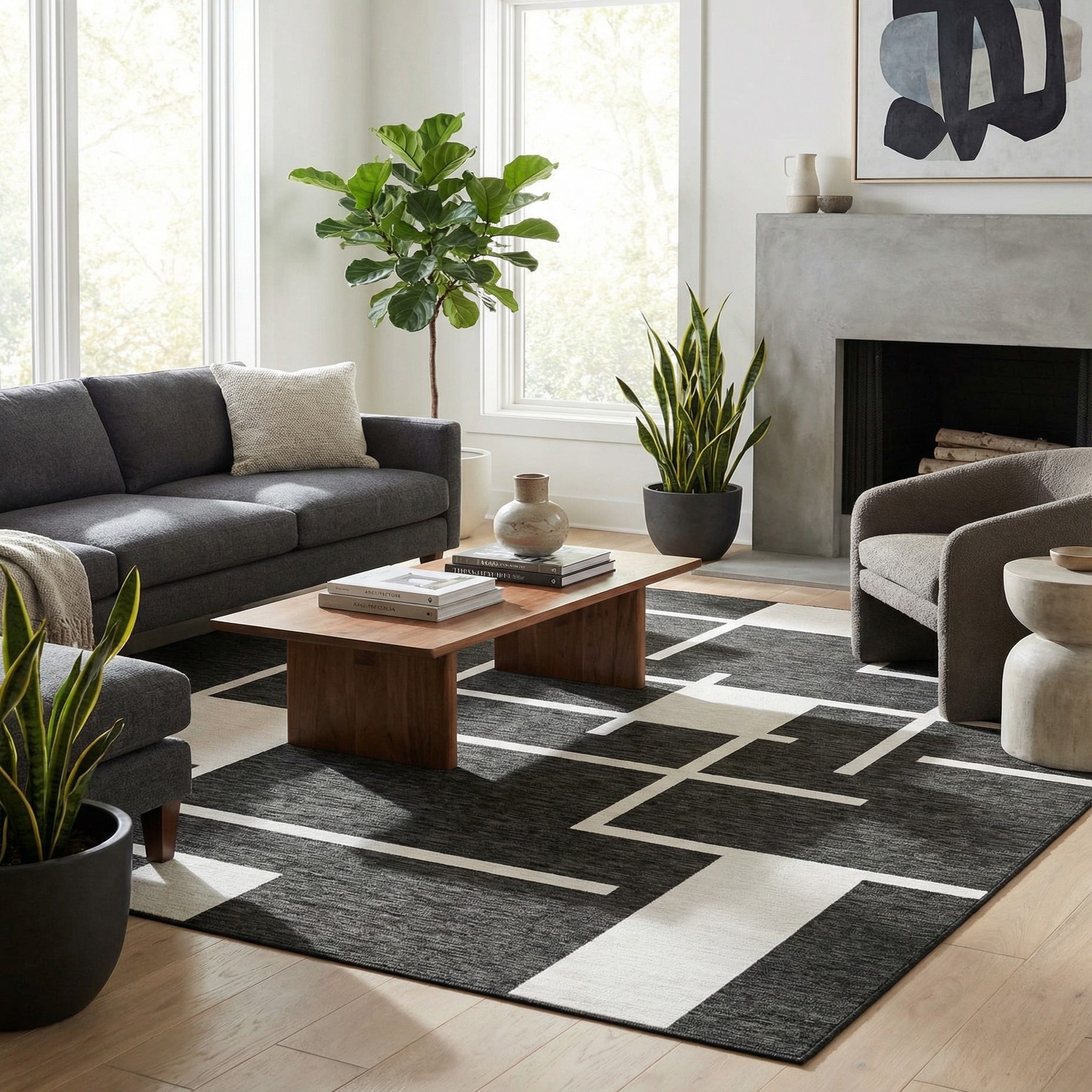 A 13' square black and white modern abstract rug with a geometric pattern of intersecting lines and rectangles.