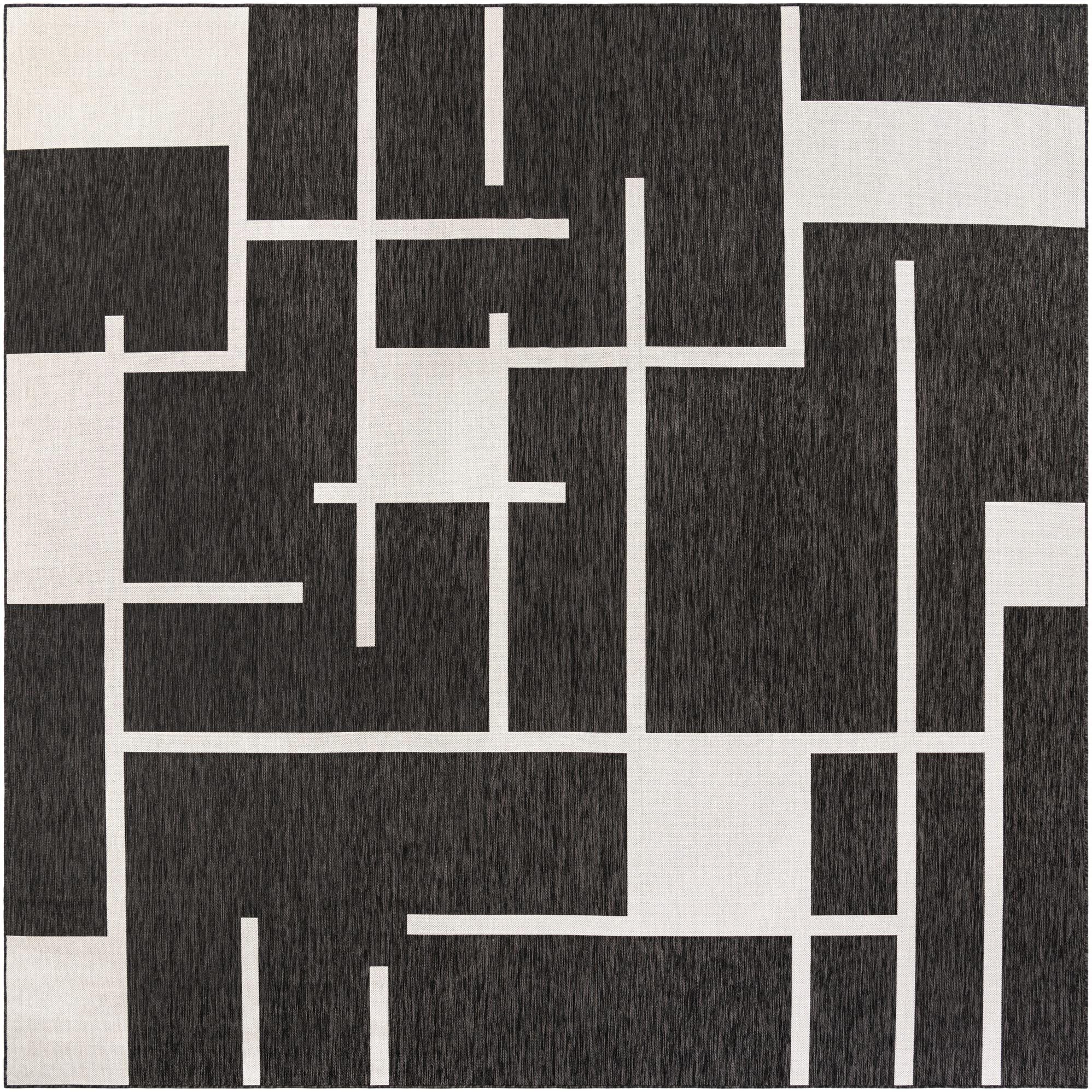 A 13' square black and white modern abstract rug with a geometric pattern of intersecting lines and rectangles.