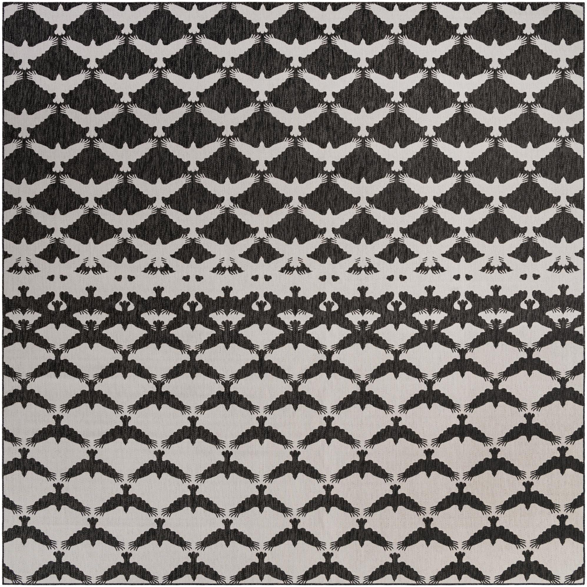 A 13' square modern black and white flatweave rug featuring a repeating pattern of stylized birds in flight.