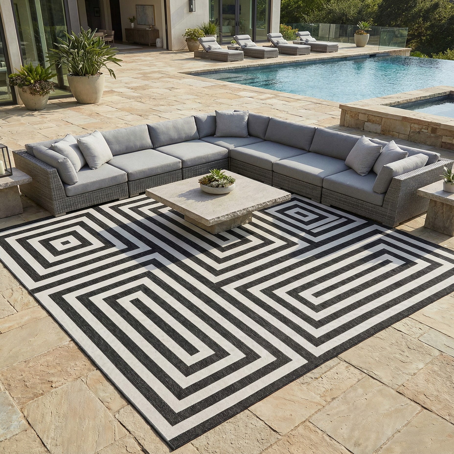 This piece works well on a covered patio or rooftop deck as easily as it does in a streamlined living room or entryway. Place it under a metal or wicker outdoor seating group to emphasize clean lines, pair it with midcentury or minimal furnishings to reinforce a modern aesthetic, or use it to anchor a monochrome dining area with a pop of accent color in cushions or planters. The geometric scale makes it ideal for defining seating zones and adding a contemporary focal point to indoor-outdoor spaces.