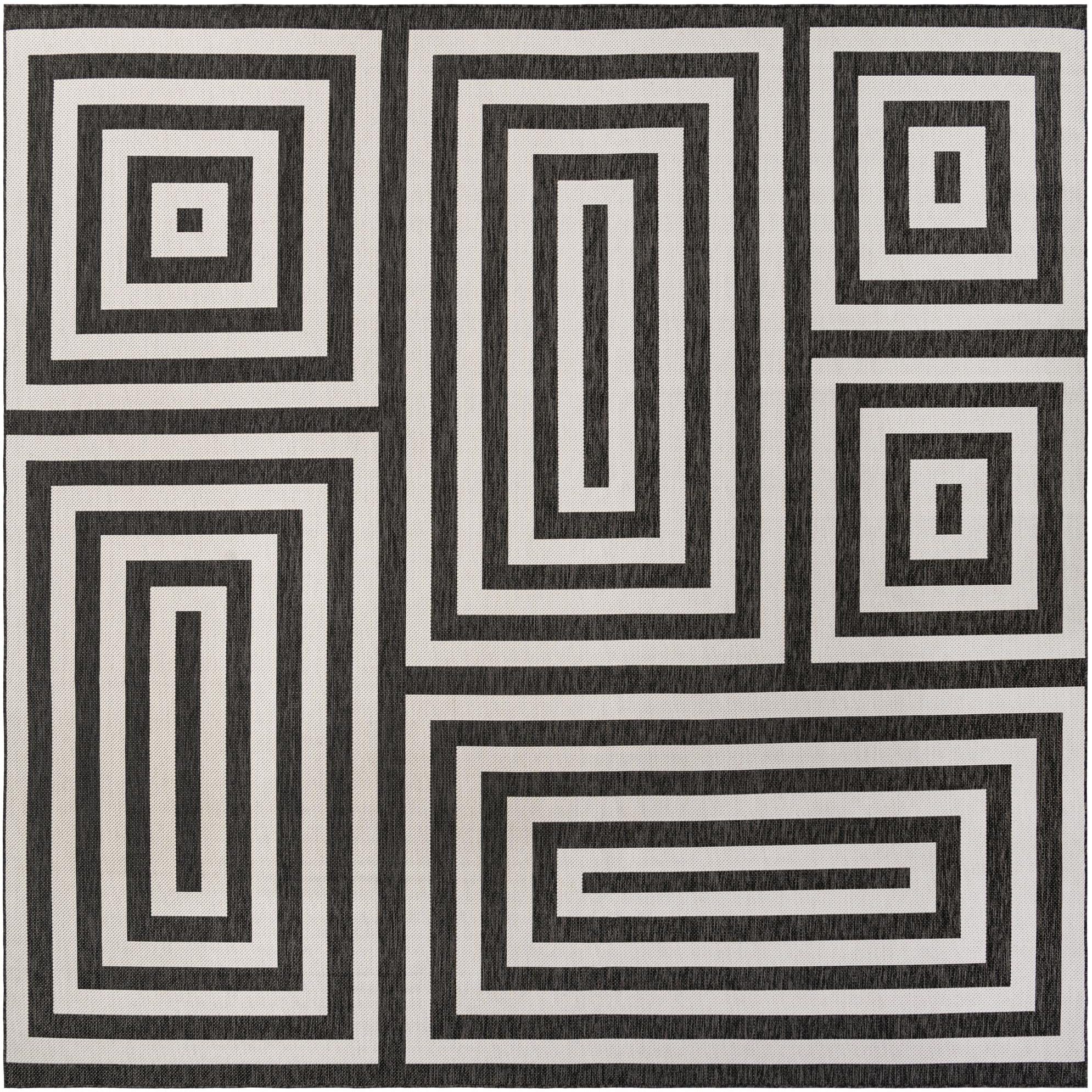 A 13' square black and white modern rug with a bold geometric stripe pattern, suitable for indoor or outdoor use.