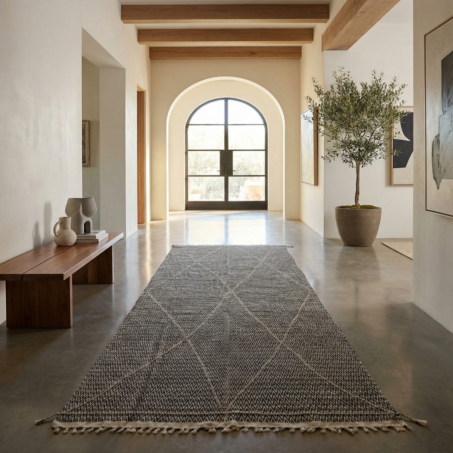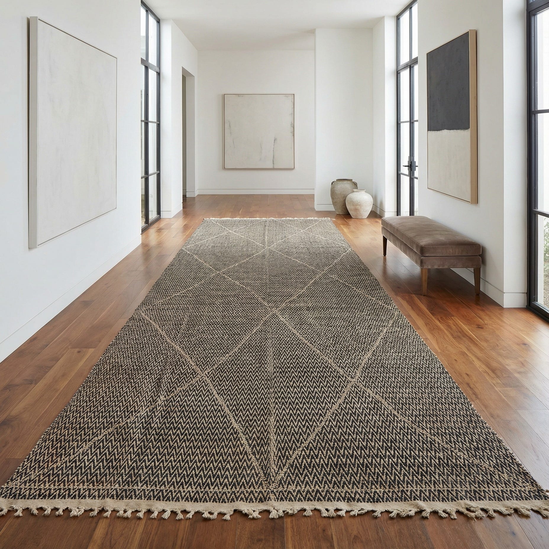 The monochrome palette and refined geometric pattern make this runner a versatile choice for transitional and contemporary interiors. Place it in a long entryway or hallway to anchor circulation, layer it beneath a console to add pattern without competing with furniture, or run it along the side of a bed to introduce contrast and softness. It also works well in modern farmhouse, Scandinavian, or minimal-boho schemes where clean lines and tactile materials are key.