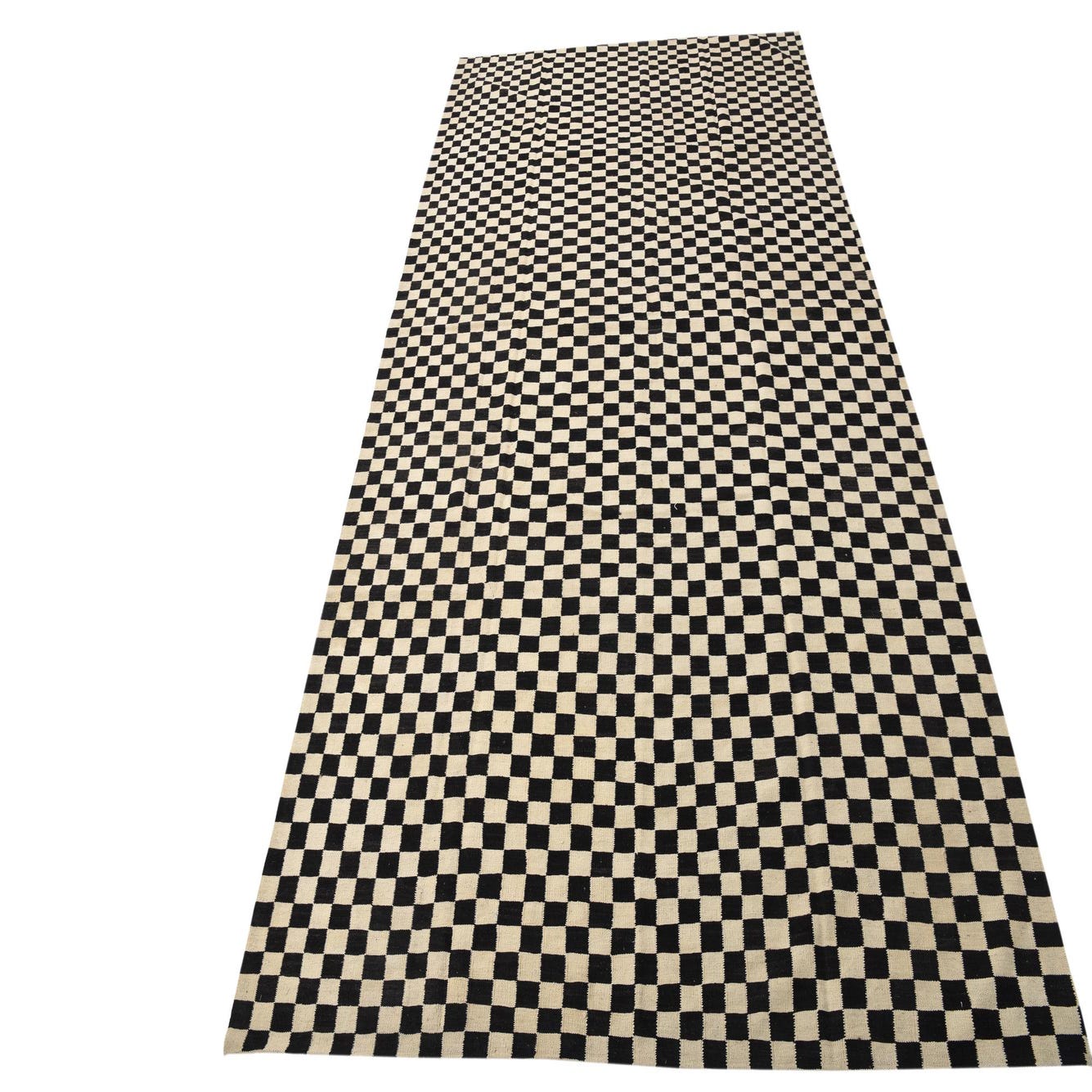 Part of the Kilim Modern collection, this 16 Ft Runner is a handwoven treasure made of 100% wool. Its two-tone black and white pattern features a checkerboard design that offers a dynamic visual contrast and a contemporary appeal. The wool's natural texture adds a tangible warmth and a soft yet durable touch underfoot.