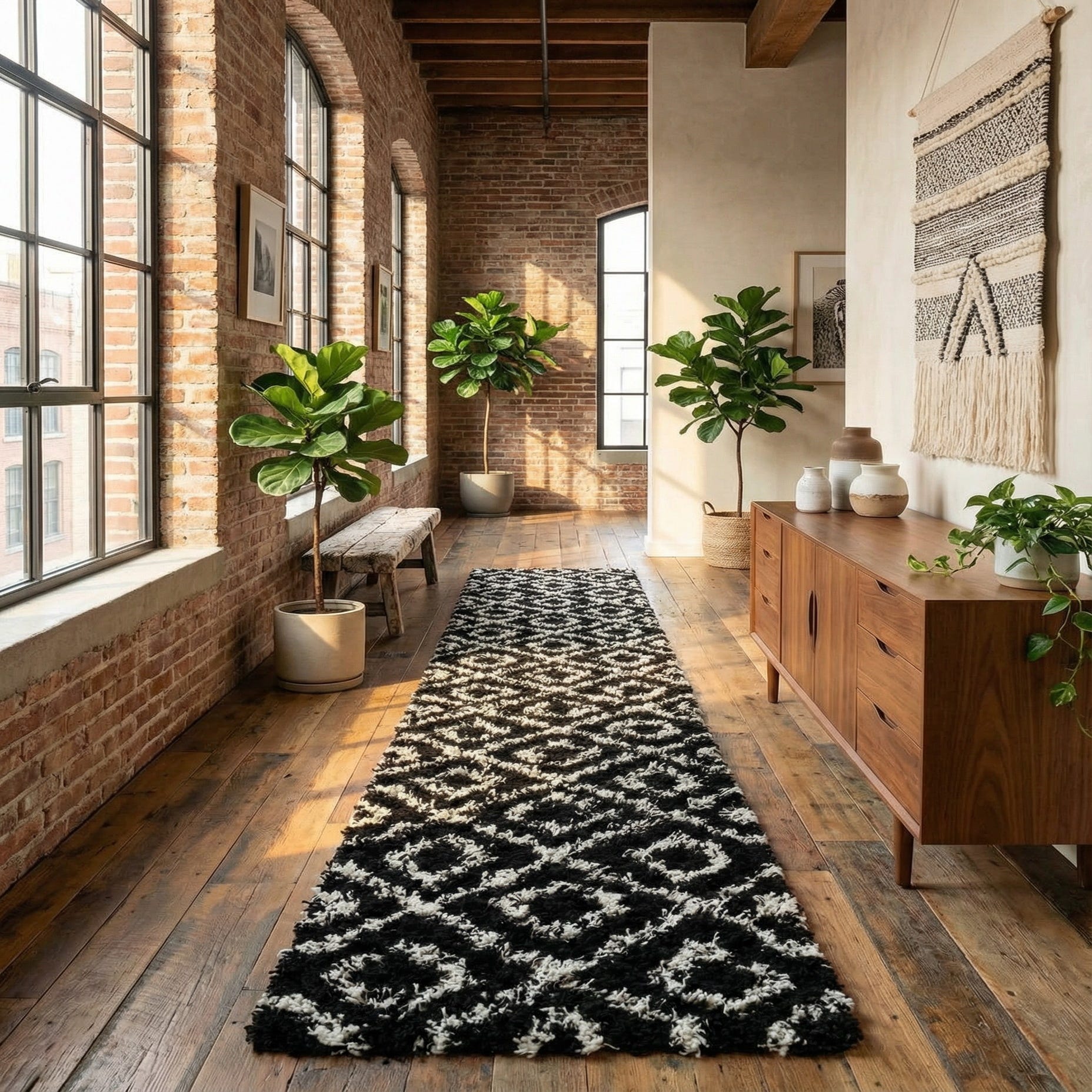 This runner works well in narrow spaces that benefit from a strong graphic anchor—think long hallways, entryways, or alongside a kitchen island. It also fits modern and monochrome interiors, pairing nicely with natural wood floors, metal accents, and minimalist furniture. Use it to introduce pattern and cozy texture into an industrial loft, a contemporary apartment, or a transitional hallway where bold contrast and tactile comfort are desired.