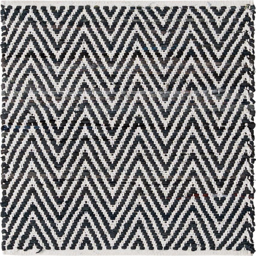A close-up of a 2x3 rectangular Chindi Chevron rug featuring a bold black and white zigzag pattern made from textured, recycled cotton.