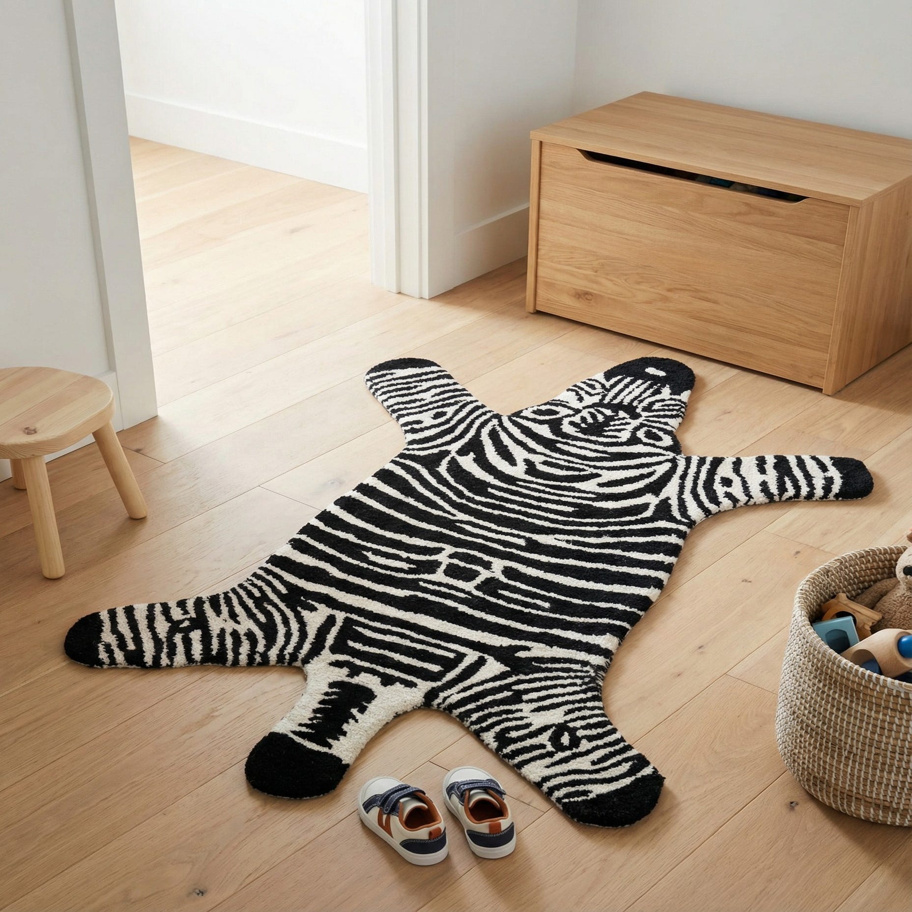 A playful free-form rug shaped like a stylized zebra hide, rendered in bold black and white stripes that create a lively, graphic pattern across the surface. The hand-tufted construction of 80% wool and 20% cotton produces a plush, tactile pile with a subtle variation where the black stripes sit against the white field, giving the piece clear definition and a soft, cushioned feel. The background color is black and white.
