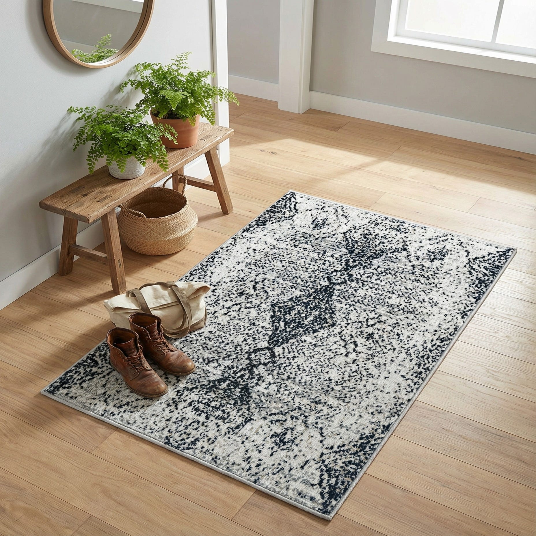 This monochrome palette pairs well with a range of interiors: layer it under a small coffee table in a contemporary living room, tuck it into an entryway or home office to anchor a seating spot, or use it beside a bed for a touch of understated pattern. It complements minimal, Scandinavian, and modern farmhouse schemes as well as industrial lofts that favor graphic contrasts.