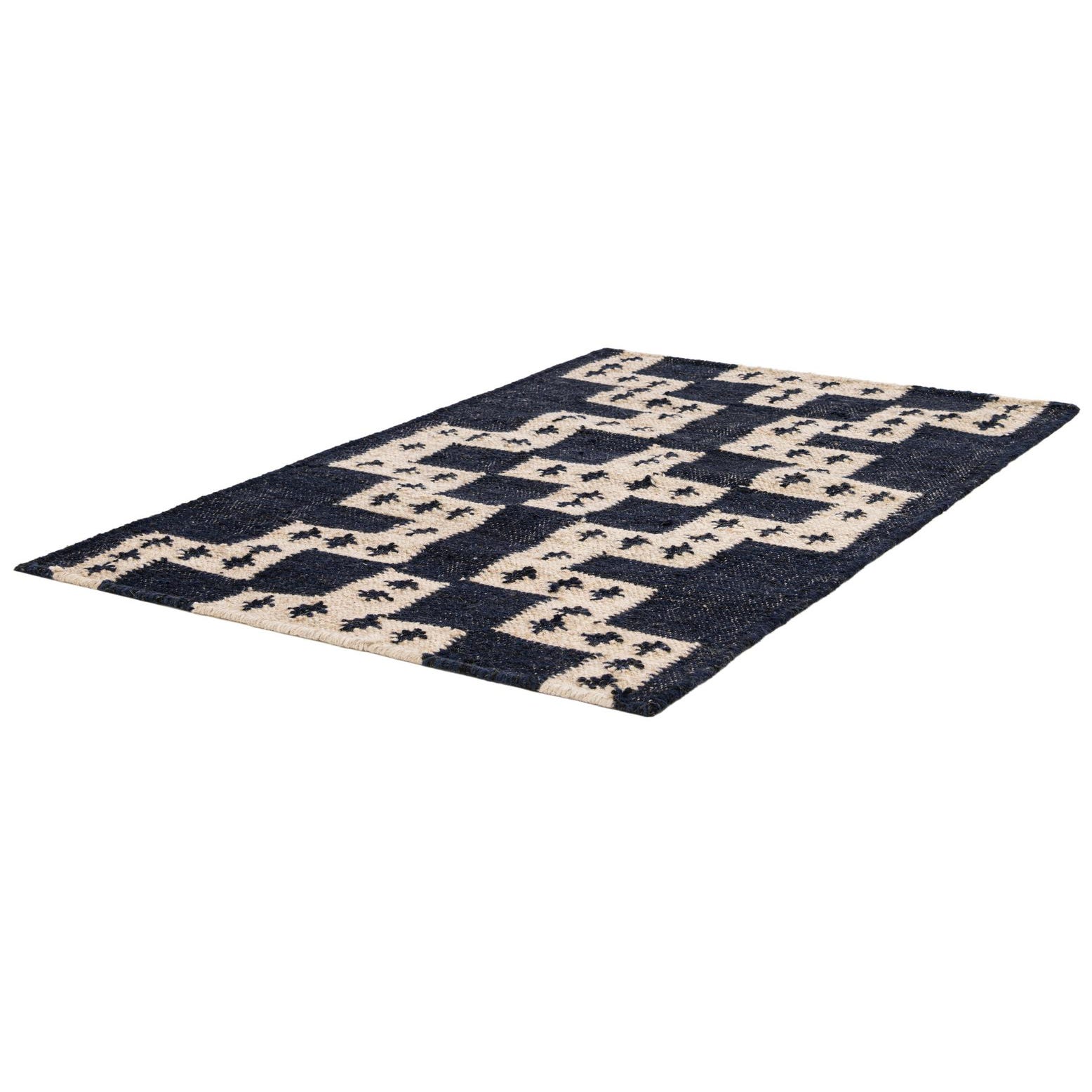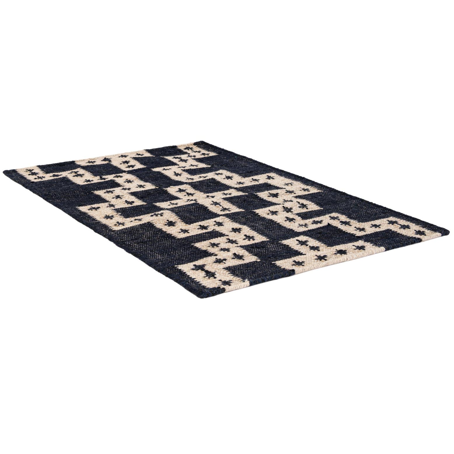 A 2x3 rectangular black and ivory Kilim wool rug with a bold tribal geometric pattern, suitable for an entryway.