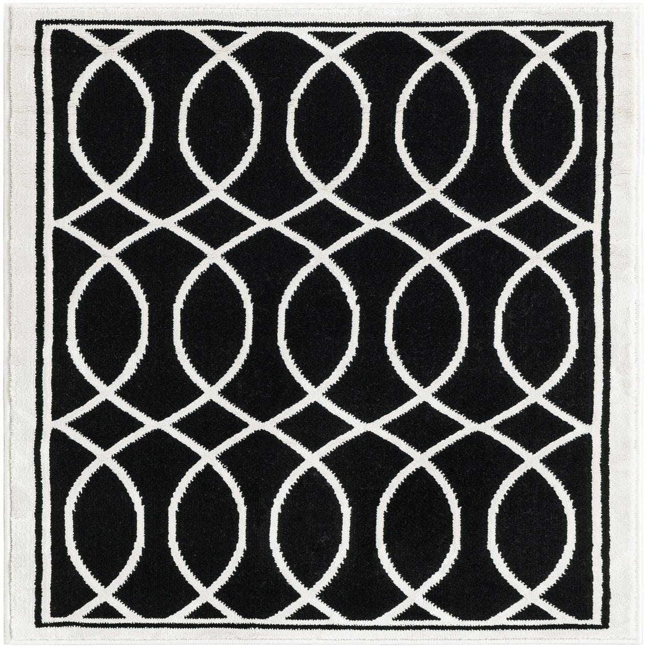 A bold, graphic trellis of interlocking elongated ovals rides across a deep black field, the crisp white lines carving a strong, rhythmic pattern that keeps the look clean and modern. A narrow white border frames the design, giving the rug a finished, tailored edge that pairs well with both minimal and layered interiors. The overall effect is contemporary and geometric, with a clear visual presence that defines a space without adding clutter.