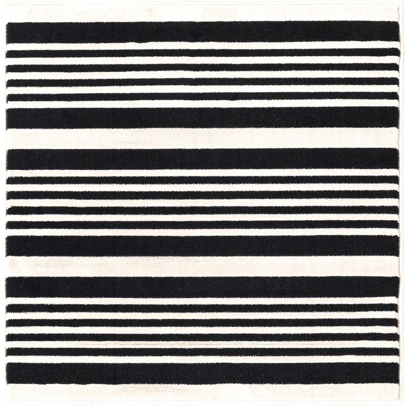 A crisp, graphic stripe pattern anchors this rug with alternating bands of black and white in varying widths. The design pairs wide, bold stripes with narrower lines to create a rhythmic, modern look that feels orderly and current. Machine-made from 100% polyester, the surface has a dense, soft texture that sits low to the floor for a supportive, smooth underfoot feel and clear, well-defined edges to each stripe.