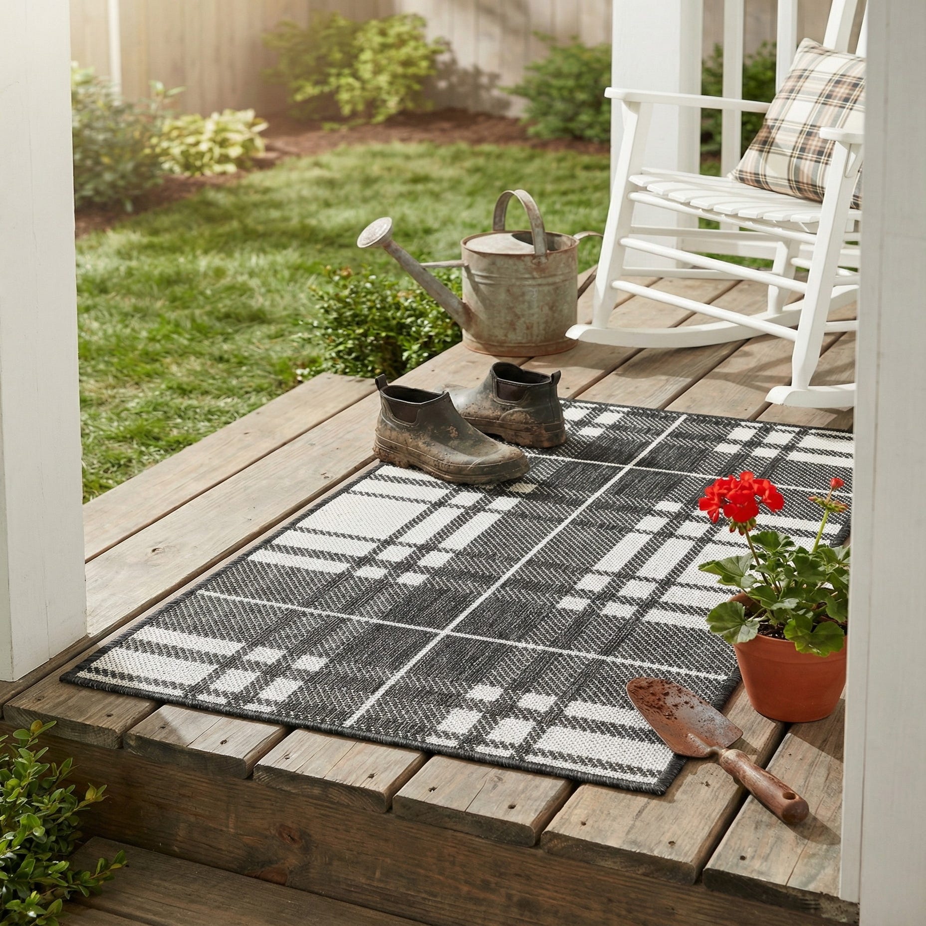 A 2x3 rectangular Rugs.com Outdoor Checkered rug featuring a modern black and white plaid pattern, suitable for indoor/outdoor use.