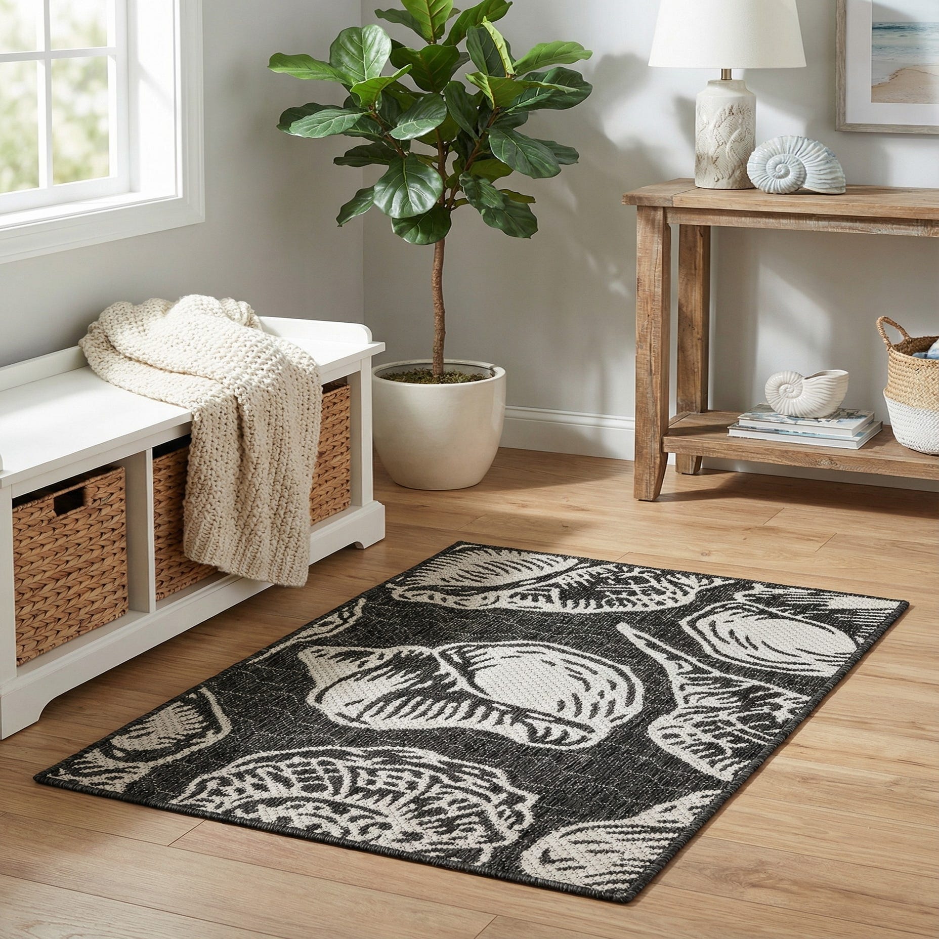 A 2x3 rectangular black and white flatweave rug with a modern coastal seashell pattern, suitable for indoor or outdoor use.