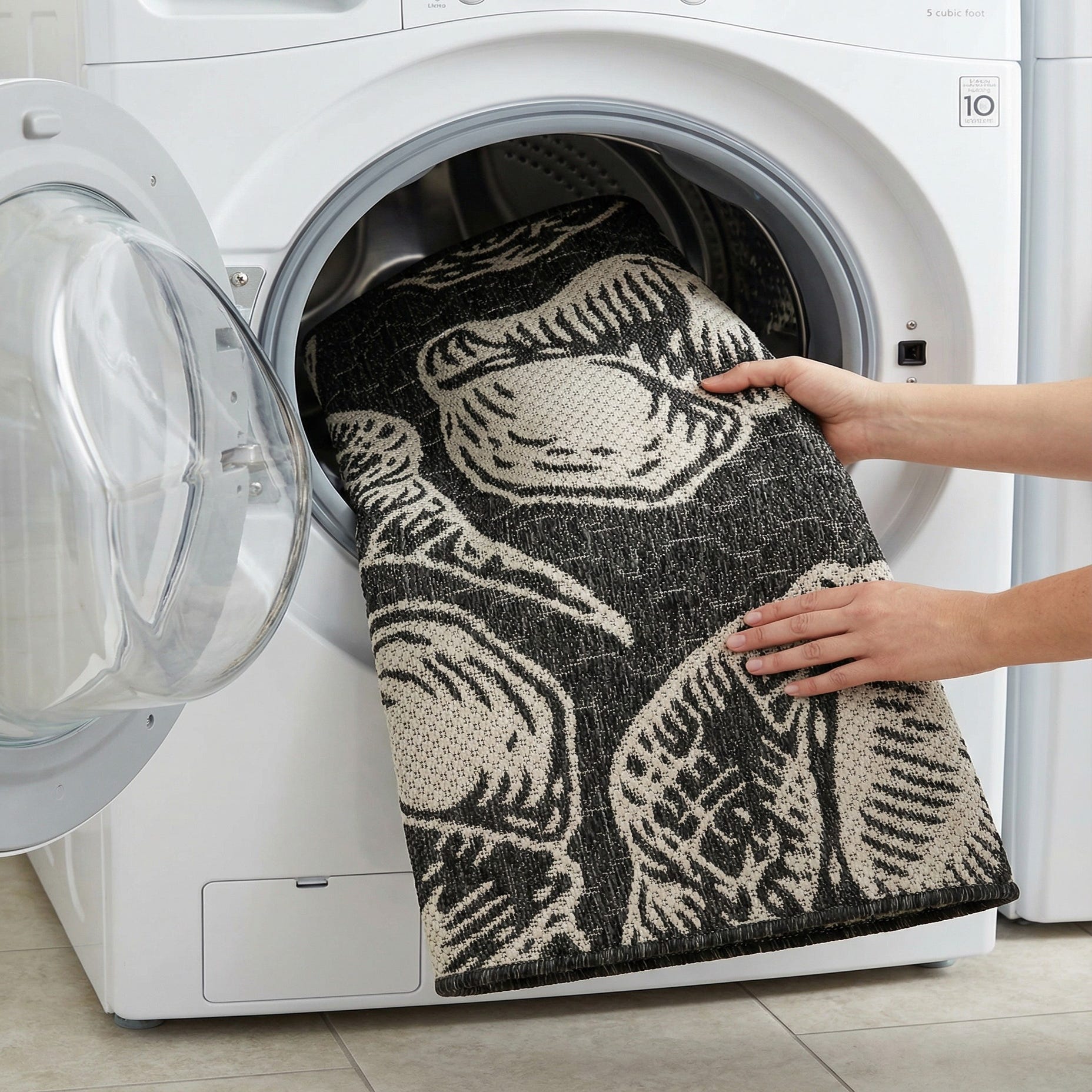 This rug works well on a covered patio or balcony, layered in a sunroom, or placed near an entry to introduce pattern without overpowering the space. Pair it with weathered wood or wicker furniture, navy or sand-toned textiles, and simple metal accents for a relaxed coastal vibe, or use it in a modern monochrome interior to add graphic contrast alongside jute, linen, and rattan elements.