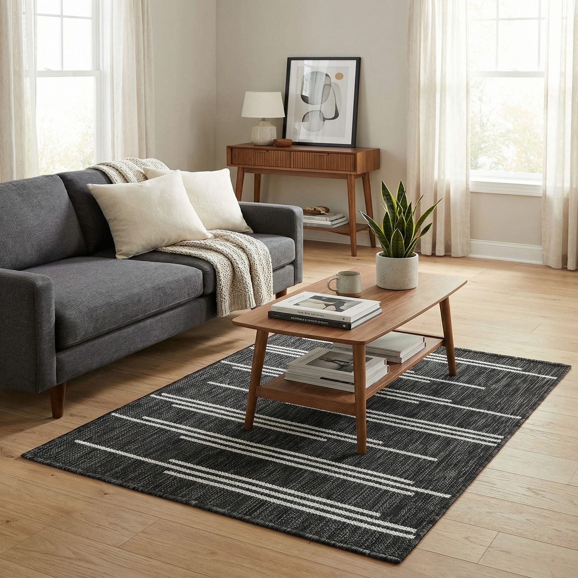 Machine made of 100% polypropylene, this piece is built for everyday use and works well in outdoor living spaces as well as busy entryways, balconies, or compact seating areas. Pair it with streamlined furniture and metal or wood accents for an industrial or minimalist look, or use it to anchor a small patio set or modern breakfast nook. Its monochrome palette makes it easy to layer with color — try it with potted greenery and textured throw cushions for a balanced, lived-in aesthetic.