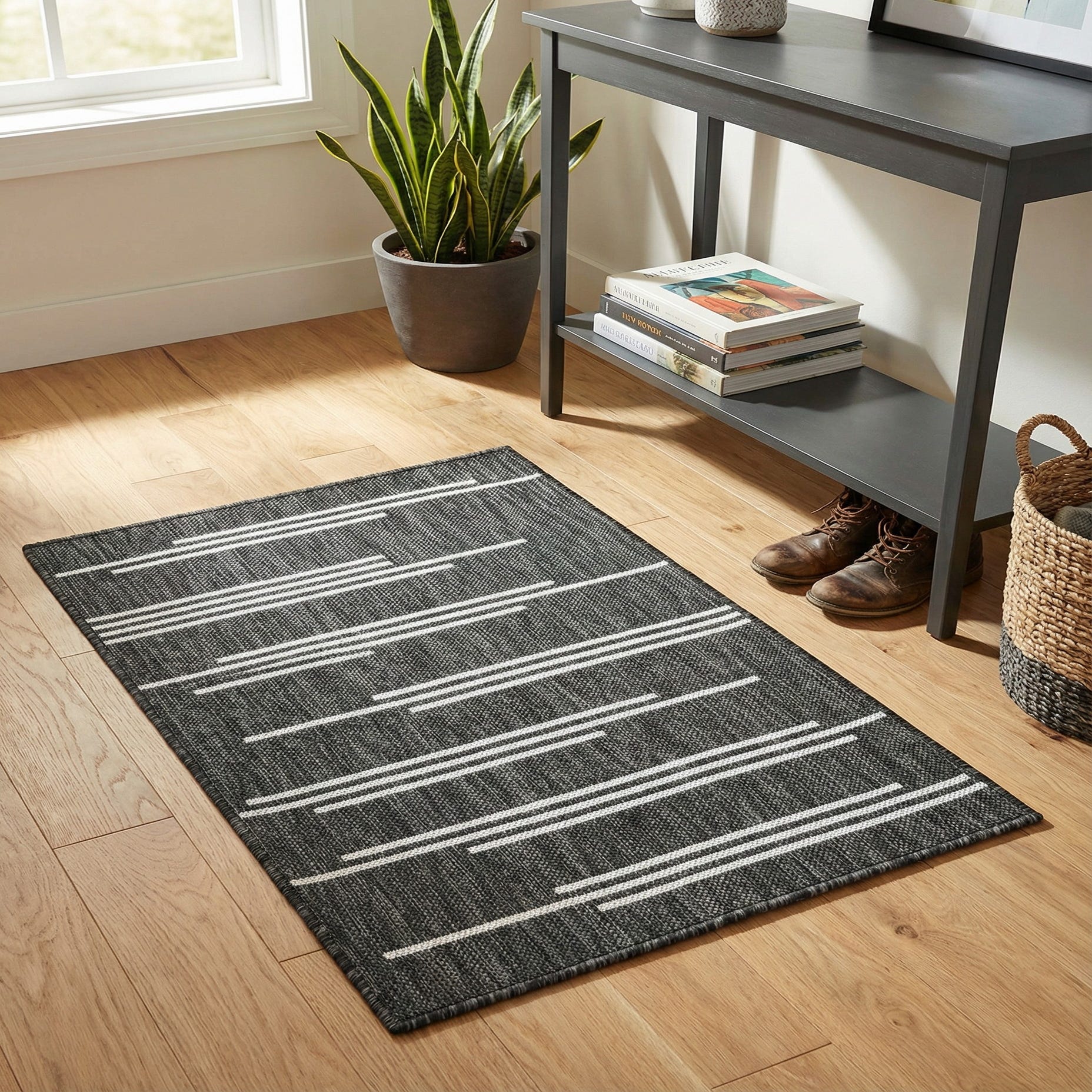 A clean, contemporary stripe pattern gives this rug a modern, graphic feel. Narrow white bands run horizontally across a tightly woven, textured ground, creating a sense of motion without overwhelming the eye. The background color is Black and White, with a slightly variegated weave that you can feel underfoot — low-profile and firm, with a subtle ribbed texture that holds its shape whether placed indoors or out.