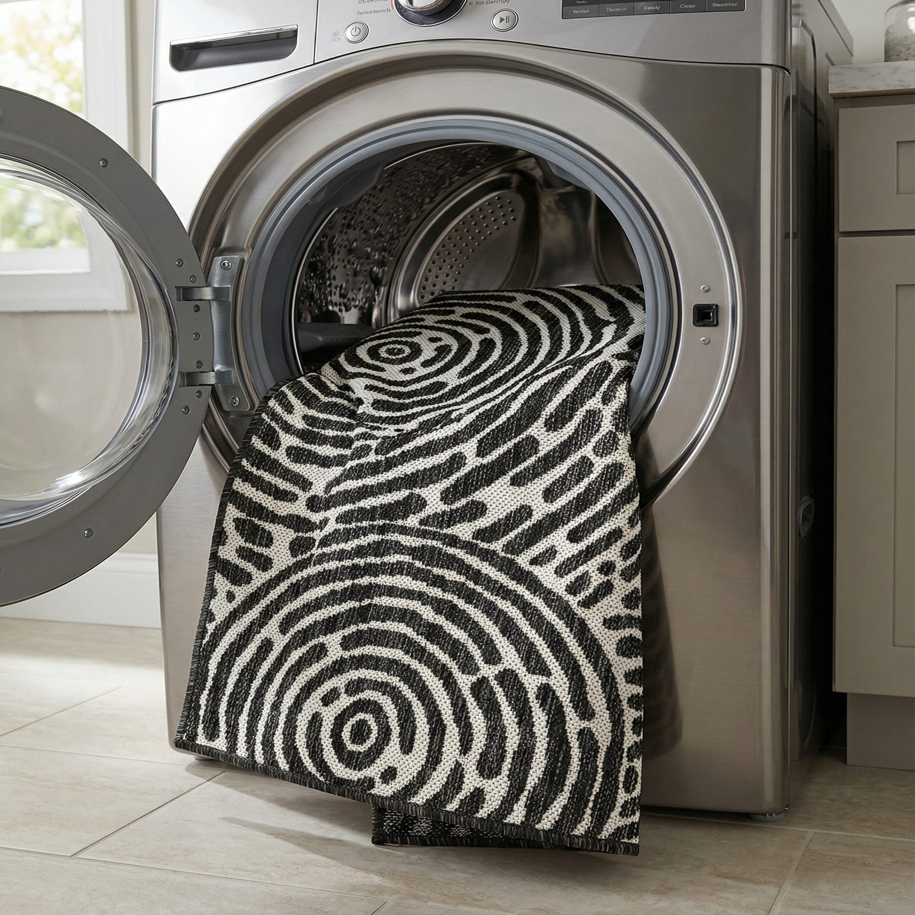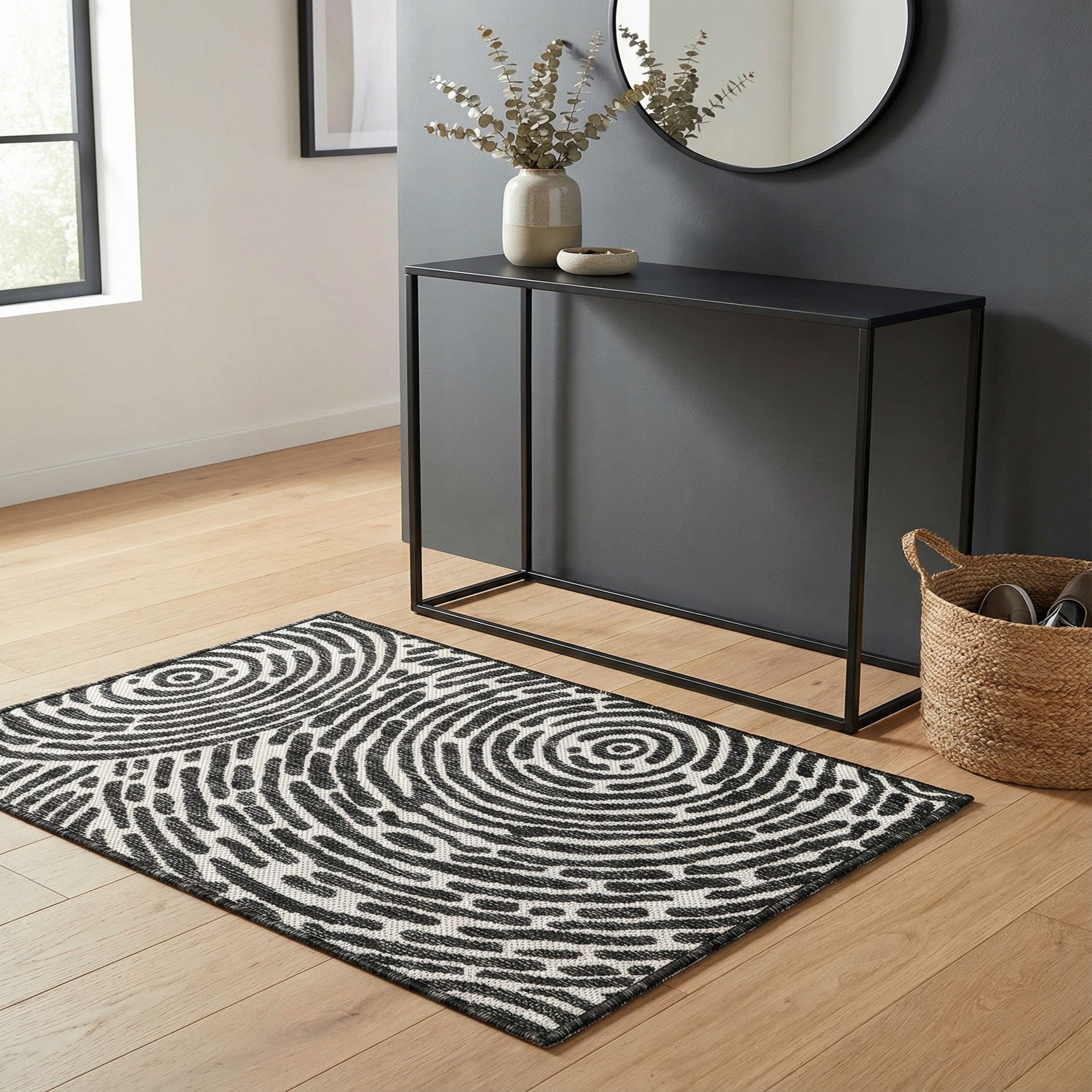 A 2x3 rectangular black and white modern abstract rug with a bold fingerprint-like pattern, suitable for indoor or outdoor use.