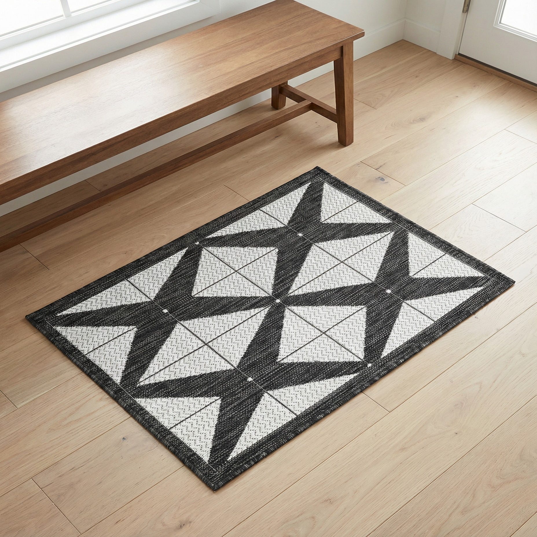 Machine made from 100% polypropylene, the rug has a low, tightly woven surface that feels firm and slightly textured to the touch—smooth enough for easy walking yet with enough weave to add visual depth. Its construction works well for busy areas: place it on a covered patio or balcony, at an entryway, or under a console in a minimalist living room. The monochrome palette pairs cleanly with natural wood, metal or concrete finishes and complements contemporary, Scandinavian, or industrial interiors.