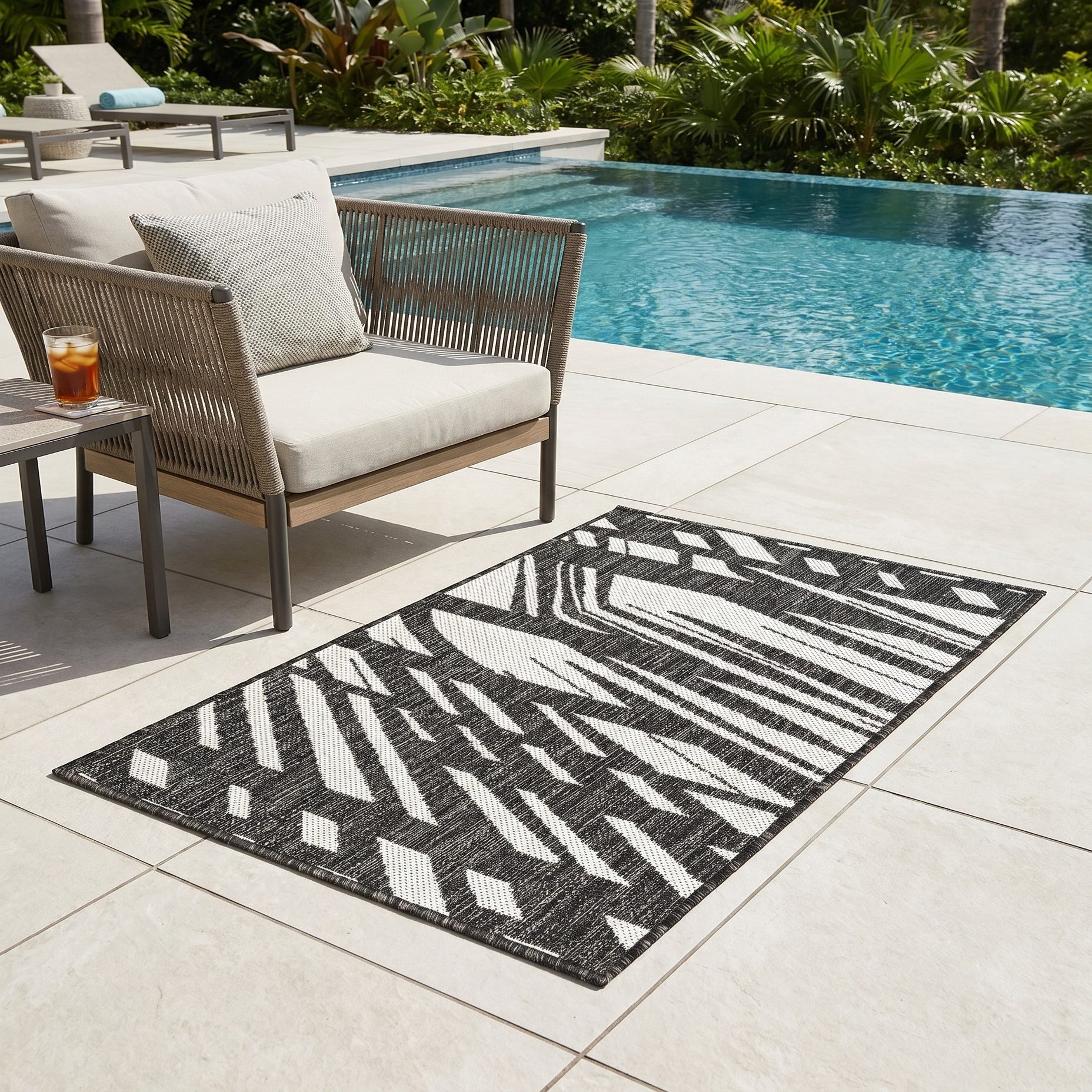 Love the contemporary look of this rug! We are so happy we chose this to accent the blue of our pool with our living area on our lanai. We still are going to add a few more pillows but love the rug to add color.