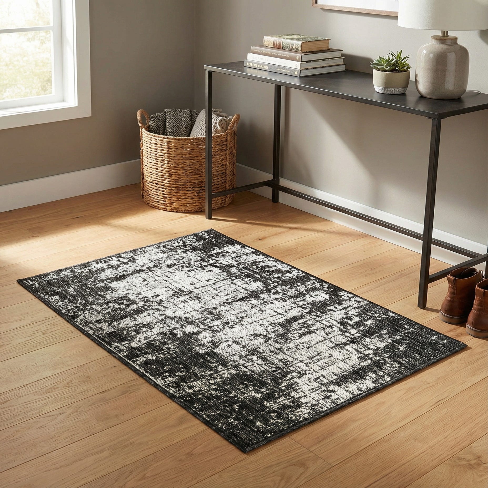 A 2x3 rectangular black and white abstract rug with a distressed, modern pattern, suitable for indoor or outdoor use.