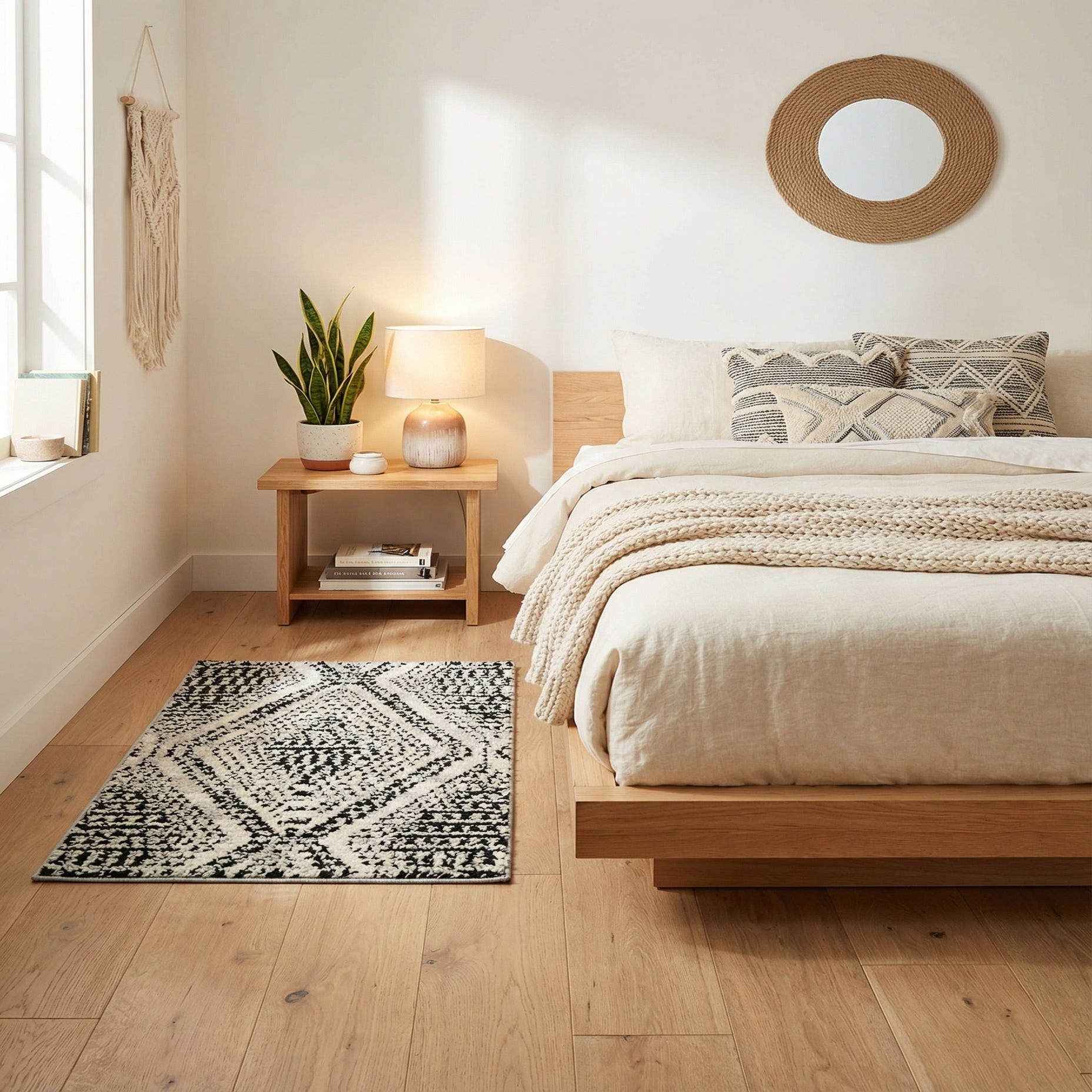 Ideal for smaller areas that need a strong graphic statement, this piece works well in entryways, layered in front of a sofa, at the foot of a bed, or beneath a compact desk. It pairs naturally with minimalist and Scandinavian interiors, modern boho rooms with natural wood accents, or monochrome schemes that benefit from bold pattern and texture.