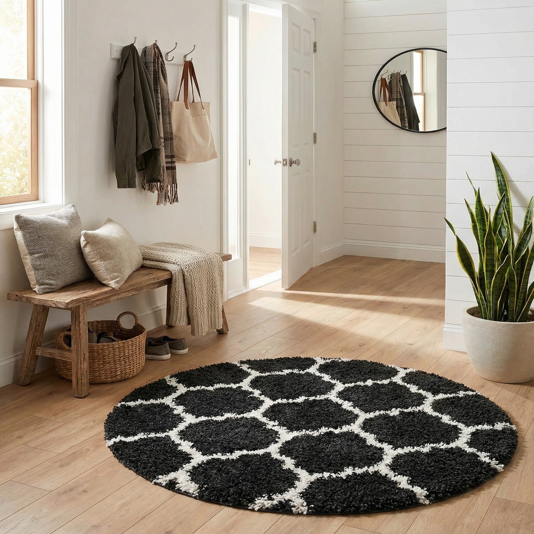A round black shag rug with a white modern geometric trellis pattern, offering plush texture.