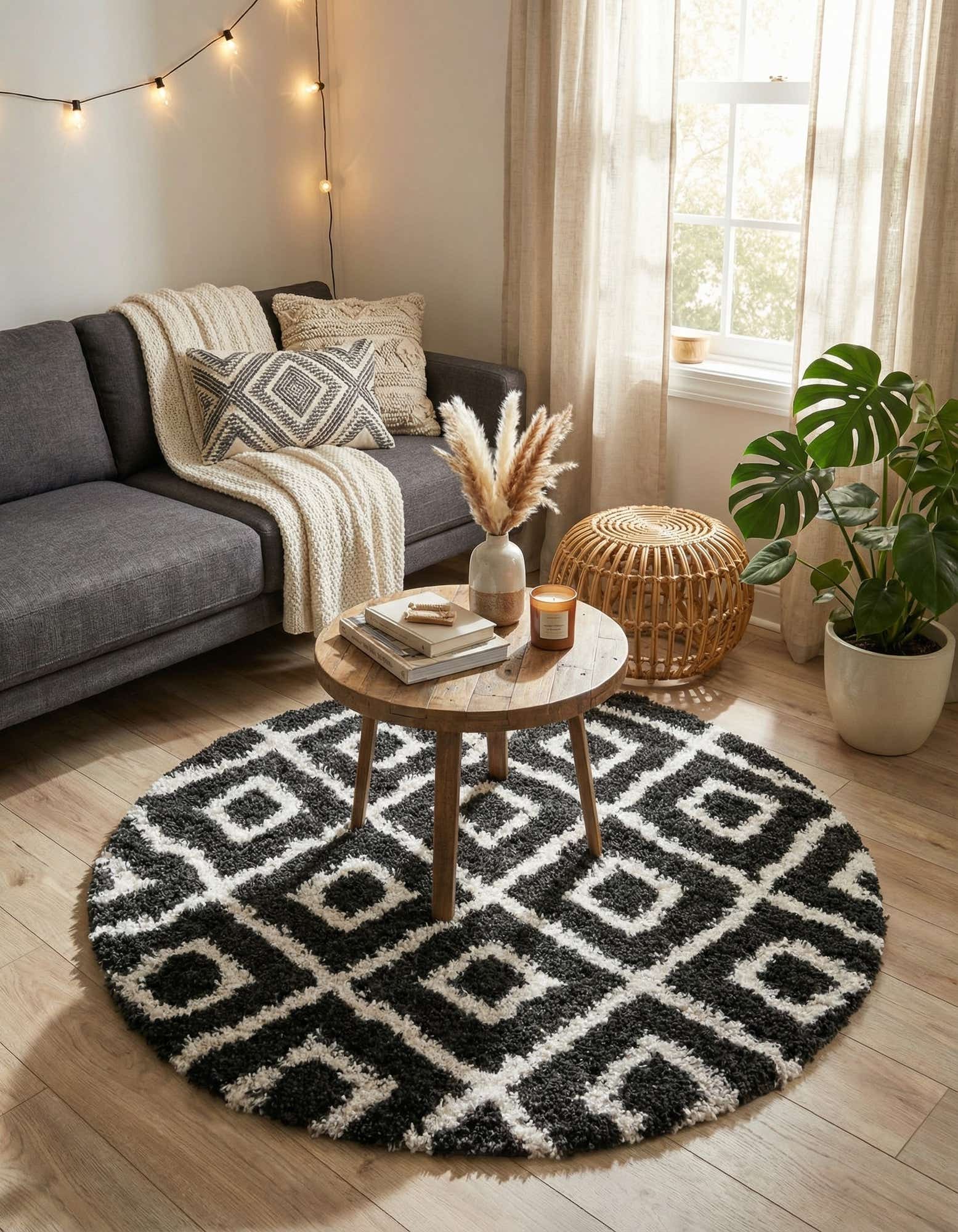 A round black and white shag rug with a modern geometric diamond pattern, ideal for a living room.
