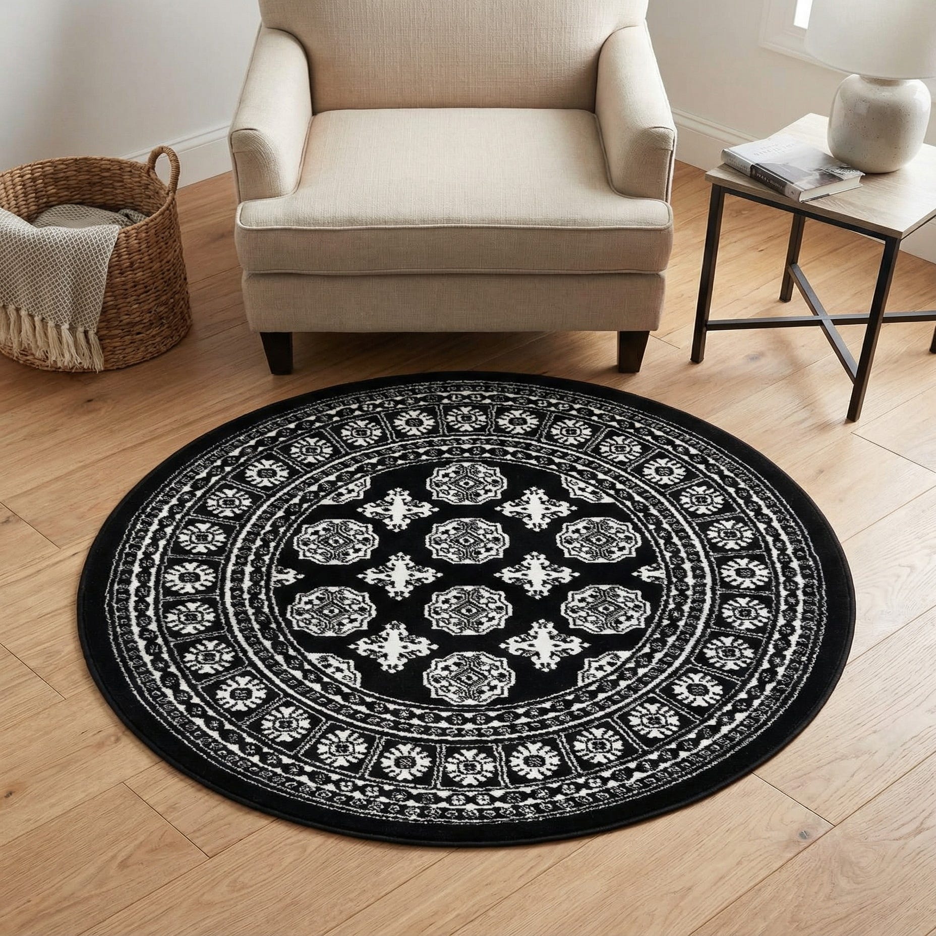 The Bokhara Collection presents a refined 3-foot round rug, machine-woven of 100% polypropylene, ensuring durability and ease of maintenance. This piece showcases a timeless design with a striking black and white color palette, featuring ivory accents that offer a strong visual contrast. The intricate patterns echo the traditional Bokhara motifs, characterized by geometric medallions and a detailed border, providing a sense of elegance and continuity.