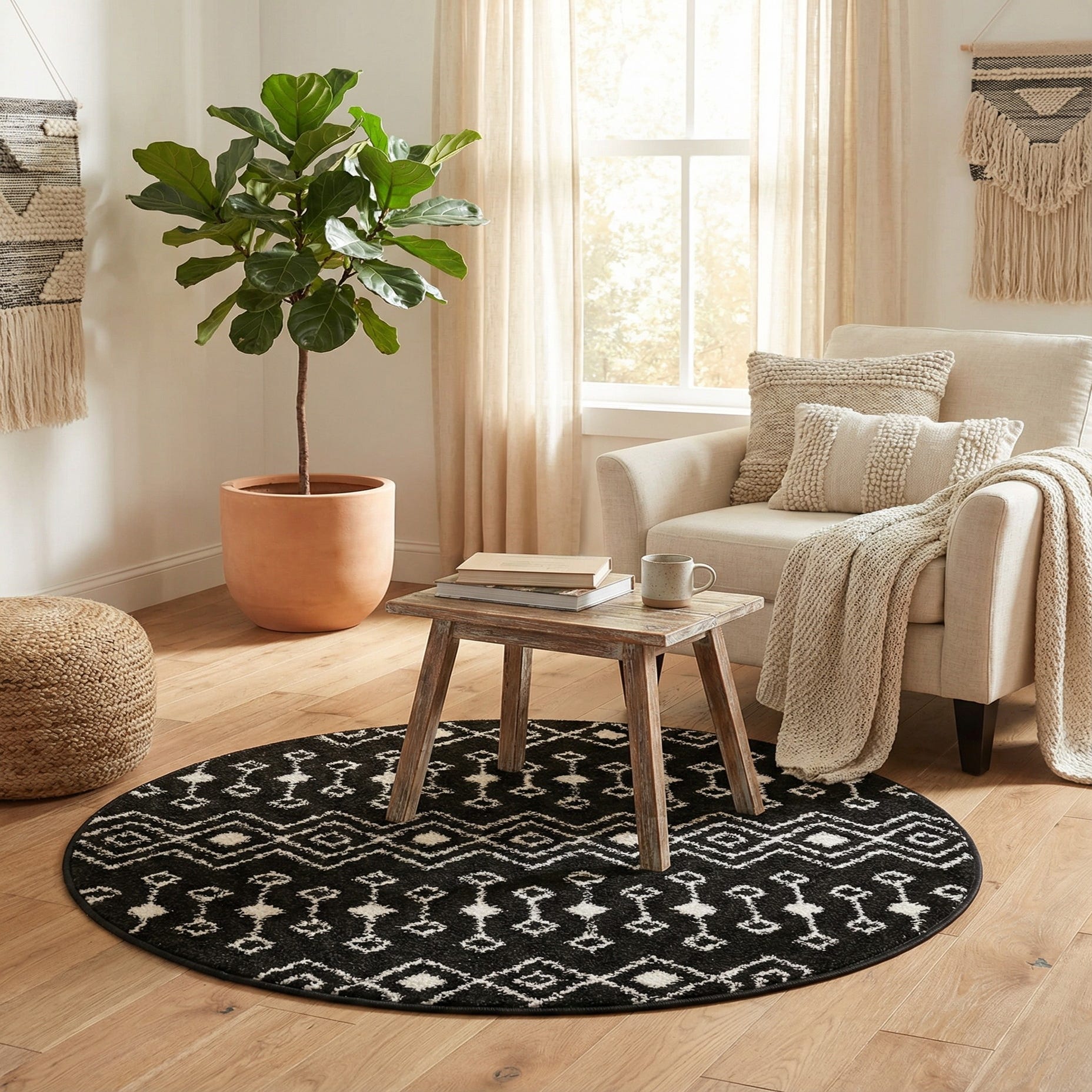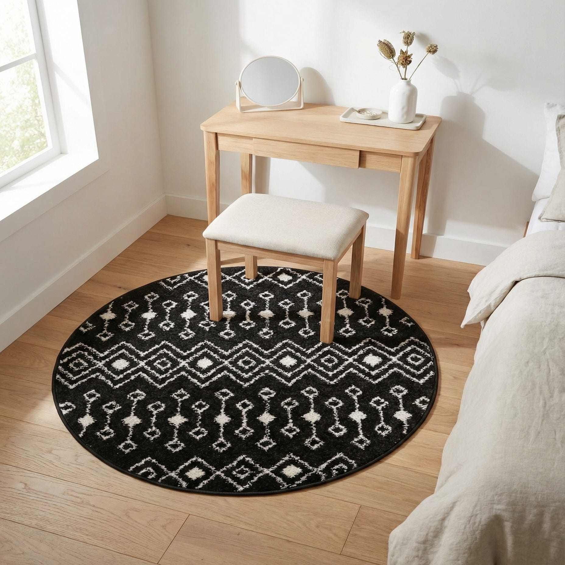 Machine-made from polypropylene, the low-pile construction has a slightly plush texture where the white motifs are raised against the smoother black field. It feels soft underfoot yet stable enough for everyday spots—perfect for anchoring a small seating vignette, warming an entry or hallway, or adding pattern beside a bedside. Pair it with streamlined furniture and metal accents for a contemporary look, layer it over a larger neutral rug for a boho-inspired mix, or set it under a round bistro table to bring bold contrast to a compact dining nook.