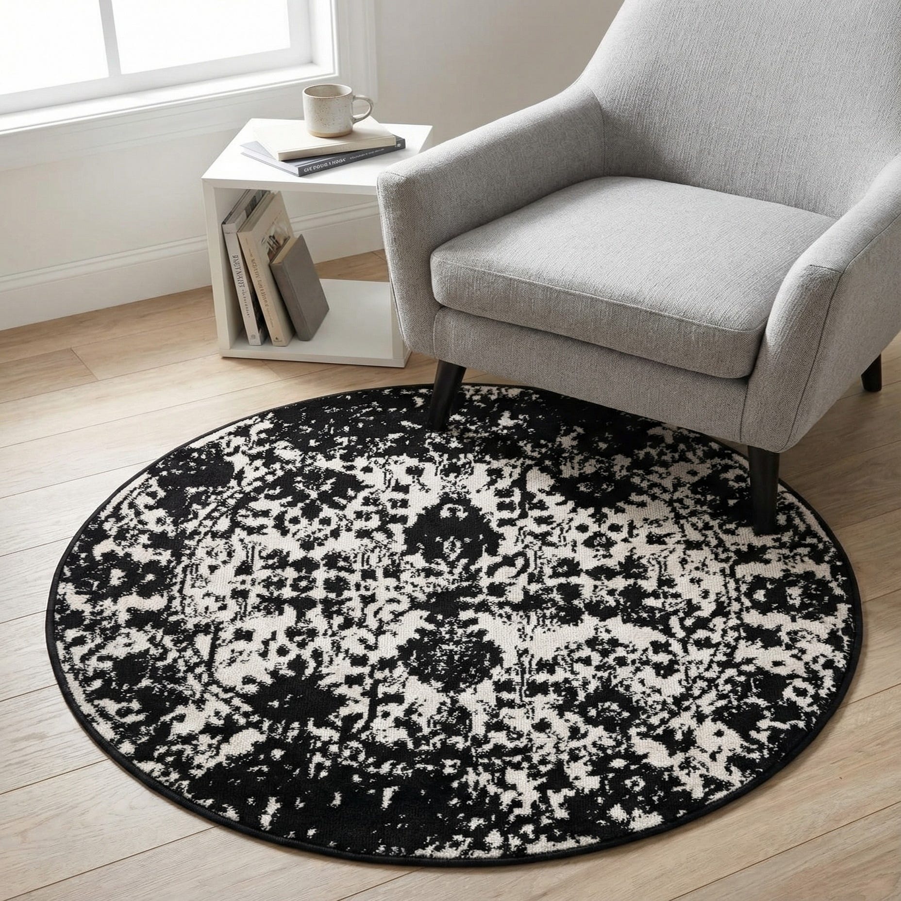 A contemporary take on a classic medallion, this round rug presents a distressed, abstract pattern in a striking black-and-white palette. The black-and-white background provides contrast while the irregular black motifs break up the surface for a lived-in, graphic look. Underhand, the pile is low and tightly woven, so the texture feels smooth with just enough density to be comfortable beneath your feet.