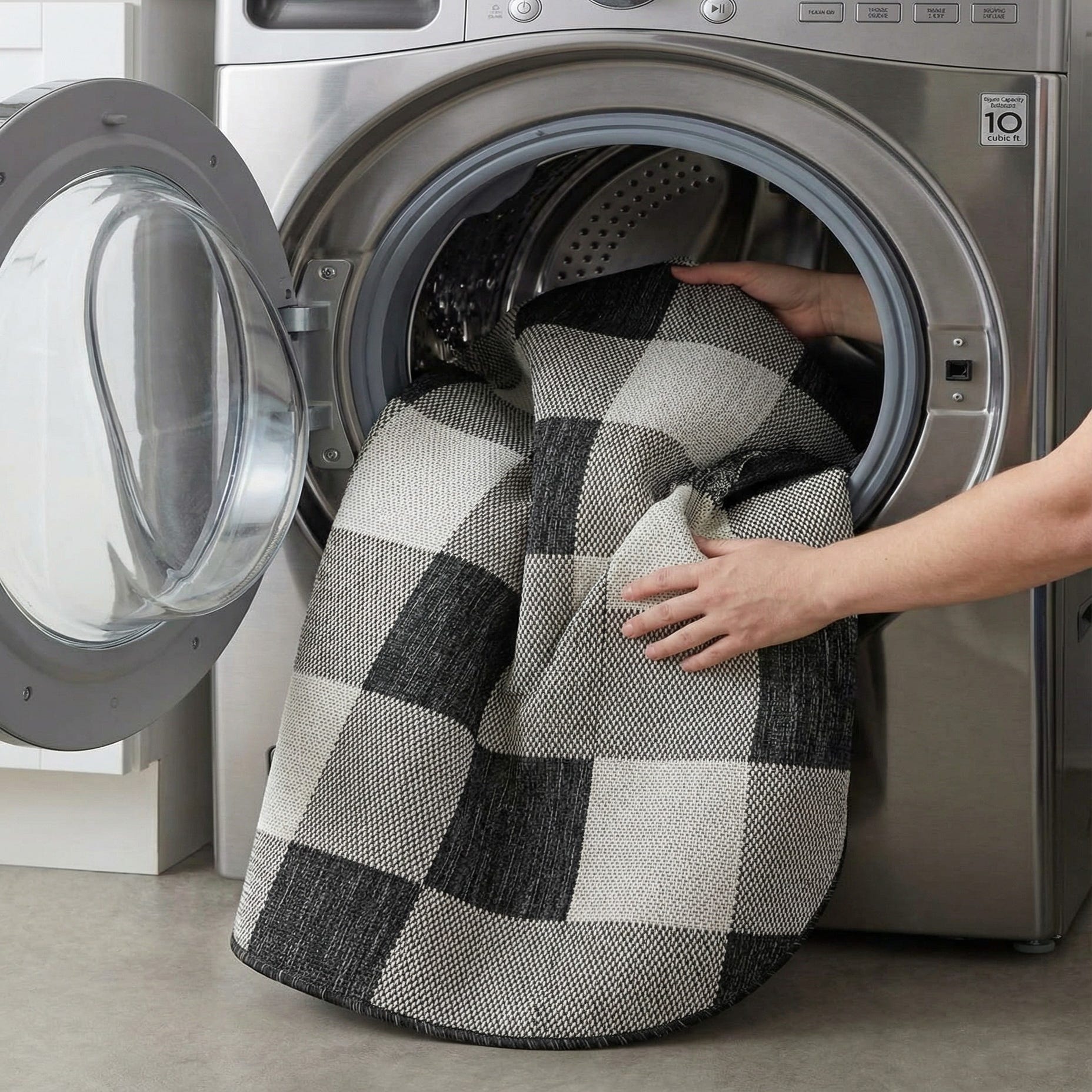 The strong monochrome palette and classic check pattern work well in a range of settings: set it beneath a small bistro table on a covered patio, layer it under an outdoor seating group to define a conversation area, or place it in an entry or mudroom for a modern farmhouse touch. It pairs naturally with natural woods, woven rattan, black metal accents, or pops of color in cushions and planters for a balanced, approachable look.