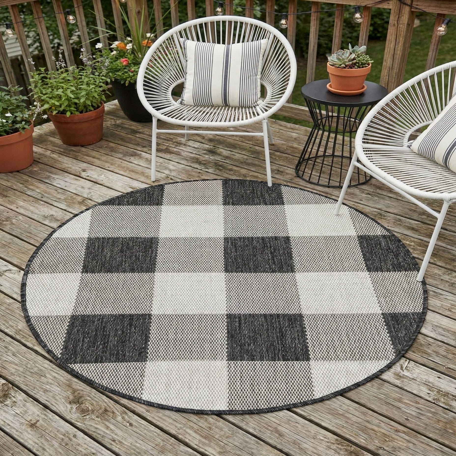 The strong monochrome palette and classic check pattern work well in a range of settings: set it beneath a small bistro table on a covered patio, layer it under an outdoor seating group to define a conversation area, or place it in an entry or mudroom for a modern farmhouse touch. It pairs naturally with natural woods, woven rattan, black metal accents, or pops of color in cushions and planters for a balanced, approachable look.