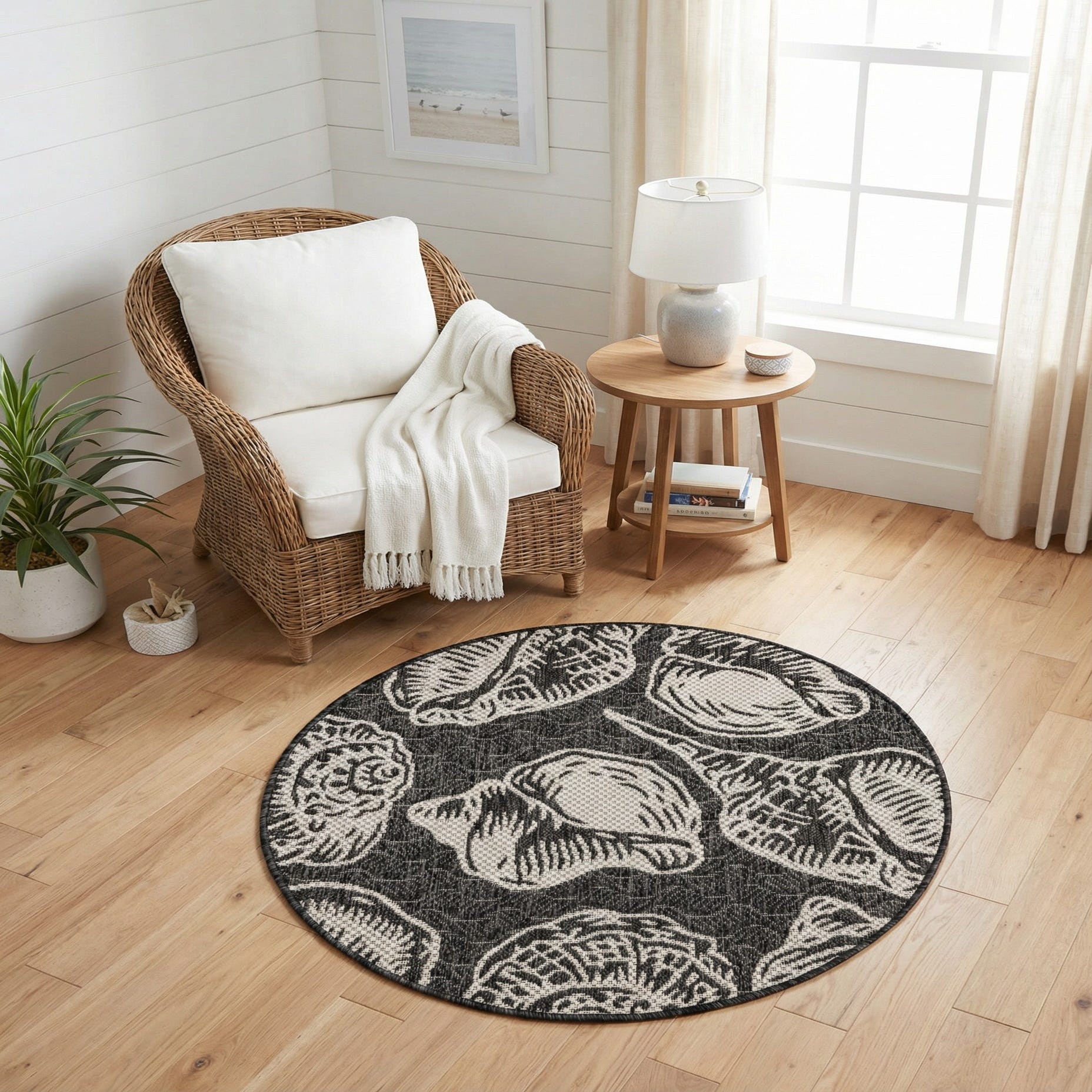 This 3 Ft Round piece from our Outdoor Coastal collection offers a compelling marine-inspired design, ideal for patios, decks, and other outdoor settings. Constructed with a machine-woven technique from 100% polypropylene, this rug features a durable flatweave that's both pet-friendly and shed-free. The black and white colorway presents a bold contrast, with a series of sizable shell motifs that adds a nautical charm to the piece.