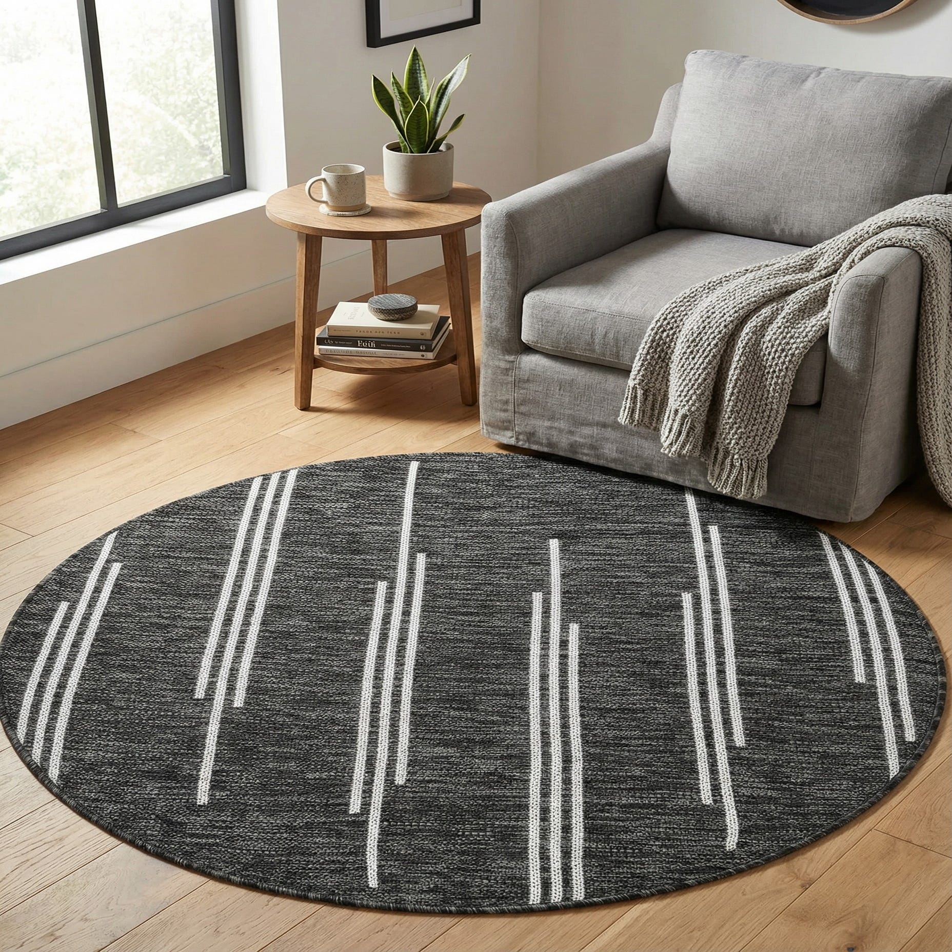 Thanks to its stain-resistant and pet-friendly characteristics, this rug is an ideal choice for areas with high traffic or outdoor settings where ease of maintenance is essential. The shed-free nature of the rug ensures that it remains presentable with minimal effort. Its round shape and graphic pattern can serve to anchor furniture in a seating area, add a visual statement in a minimalist setting, or break up the monotony of straight lines within a room.