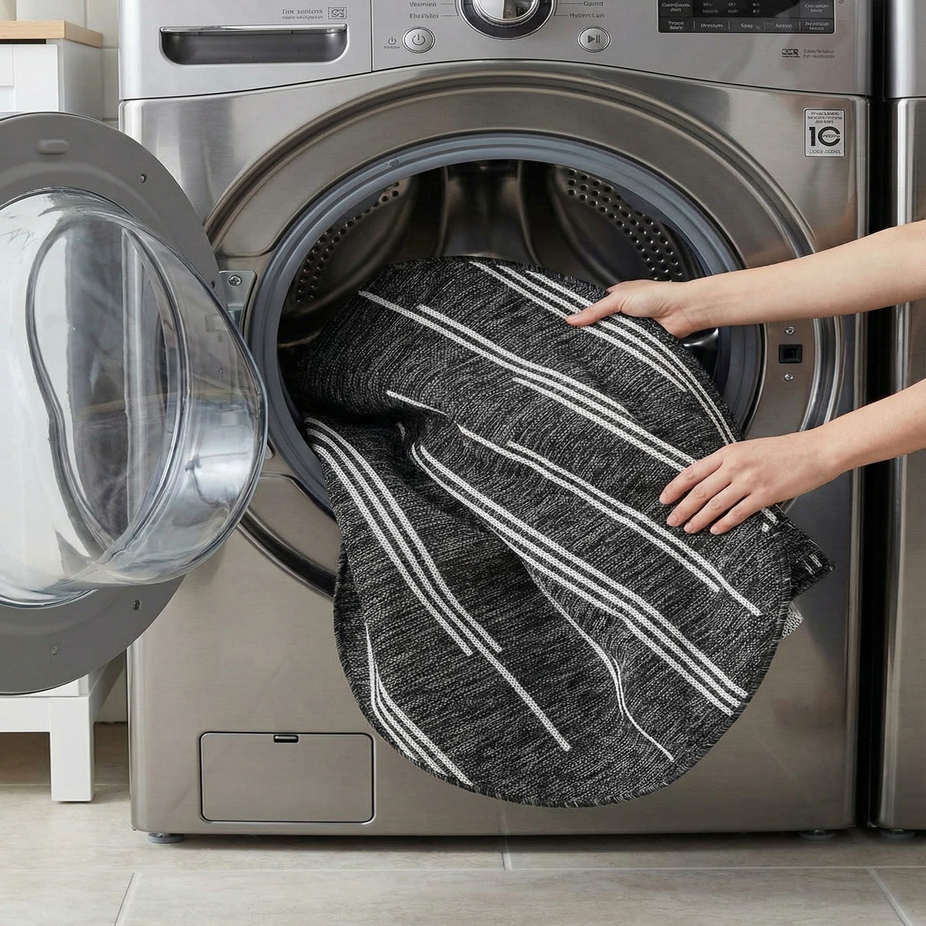 Whether placed under a coffee table, used in a balcony setting, or accentuating an entryway, this rug would meld seamlessly with modern, industrial, or Scandinavian-inspired decors. The strong graphic quality of this piece can also create a focal point in a home office or add a touch of sophistication to an outdoor entertainment area.