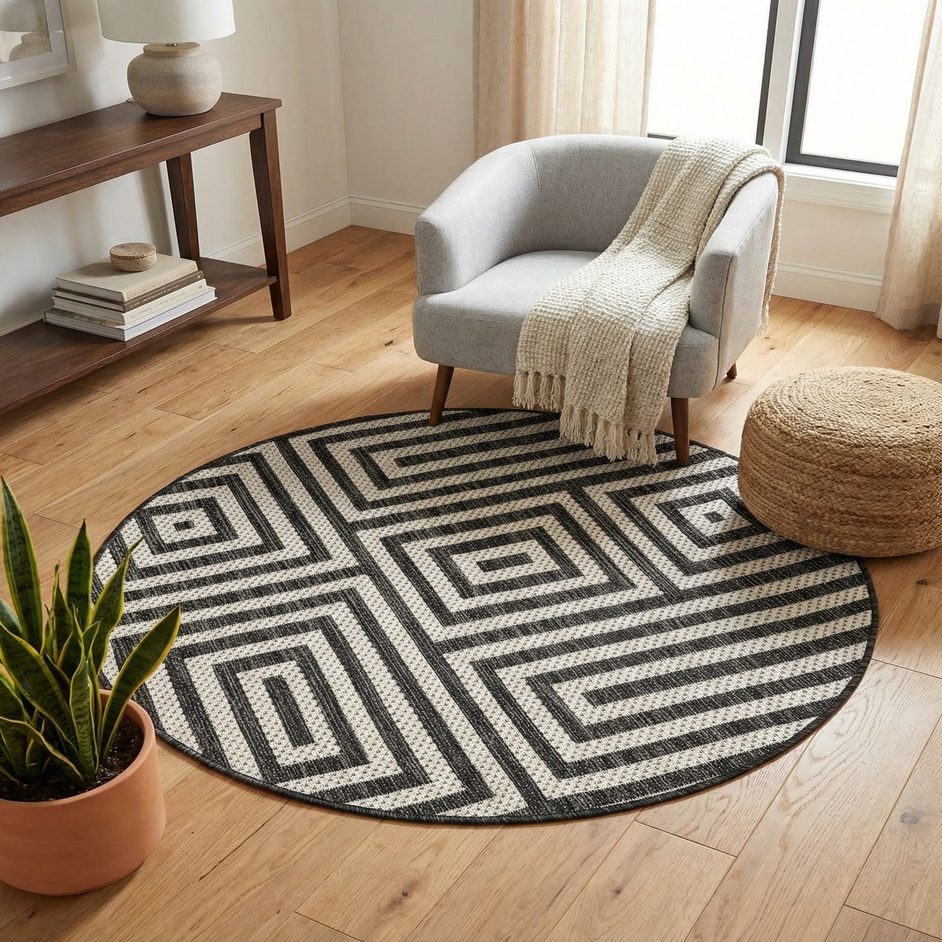 A round black and white modern rug with an abstract geometric pattern of interlocking squares and lines.