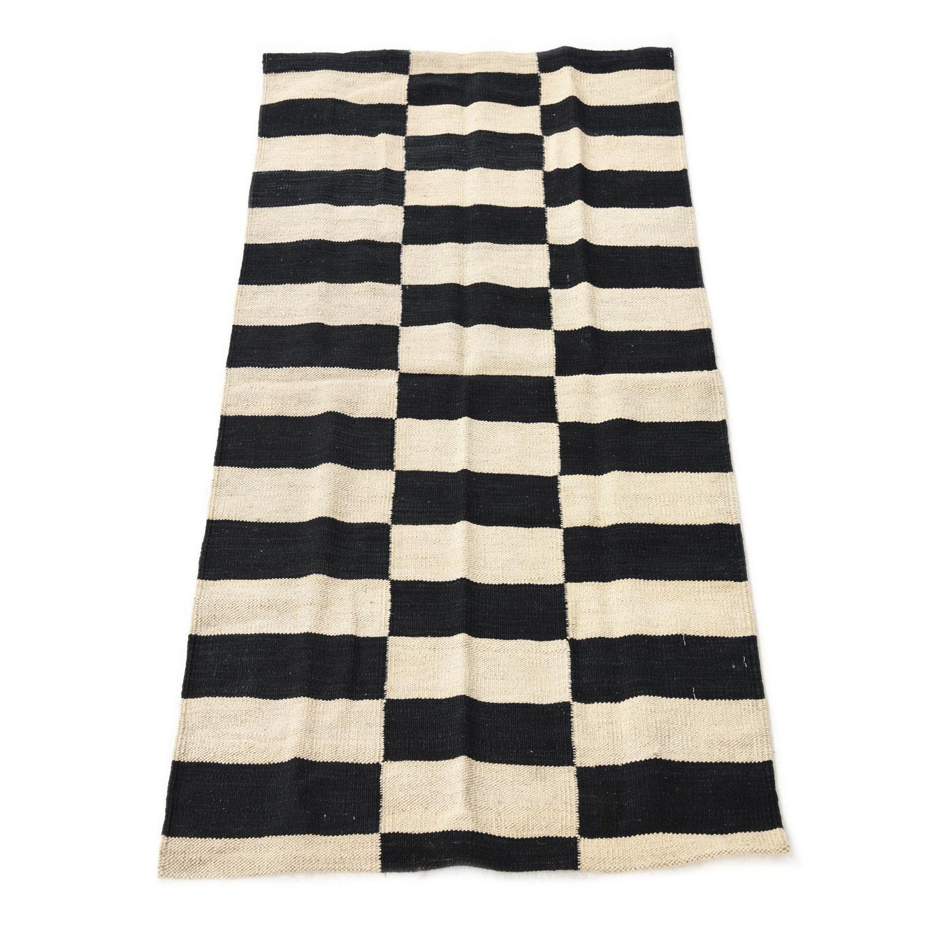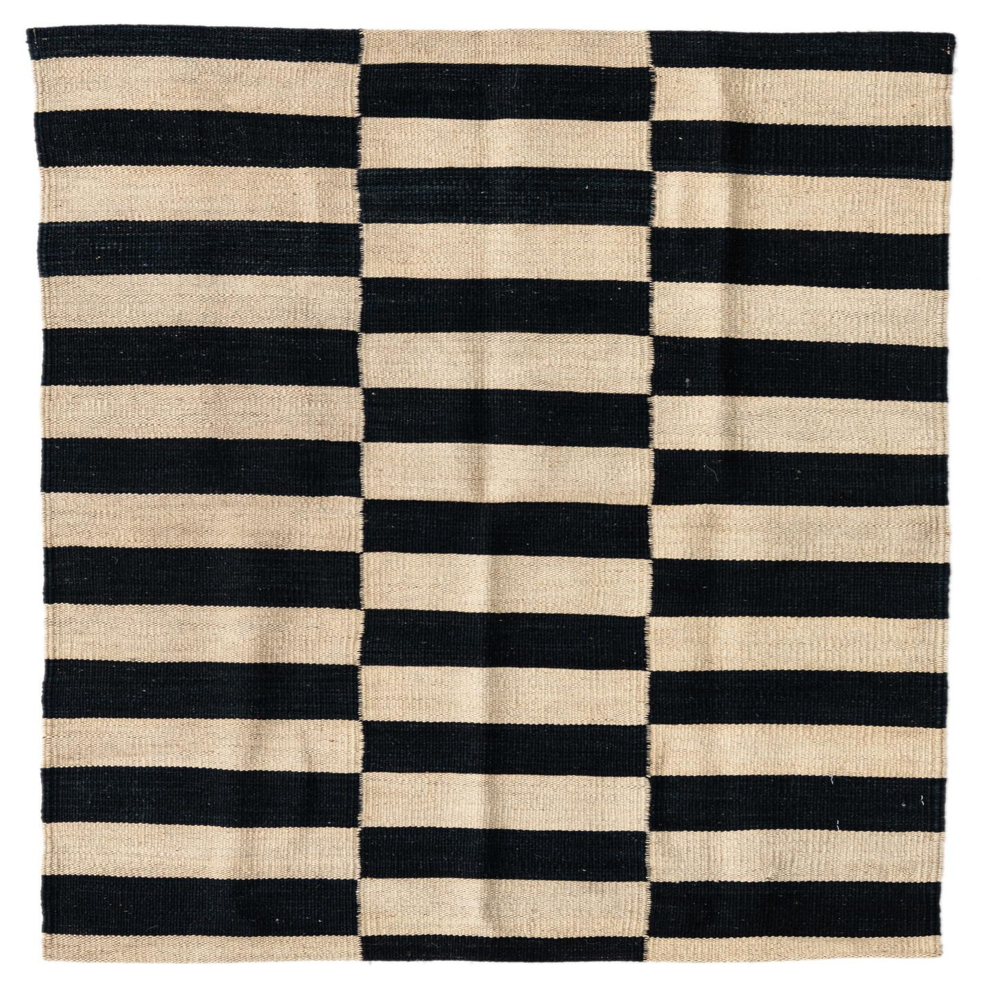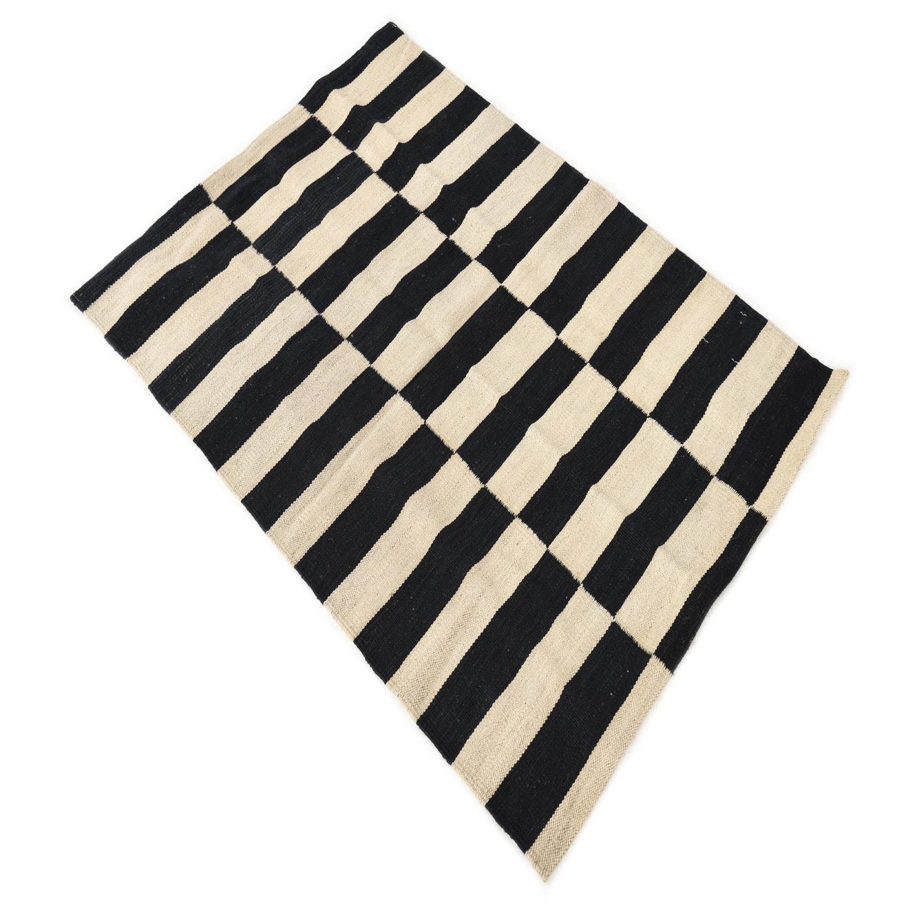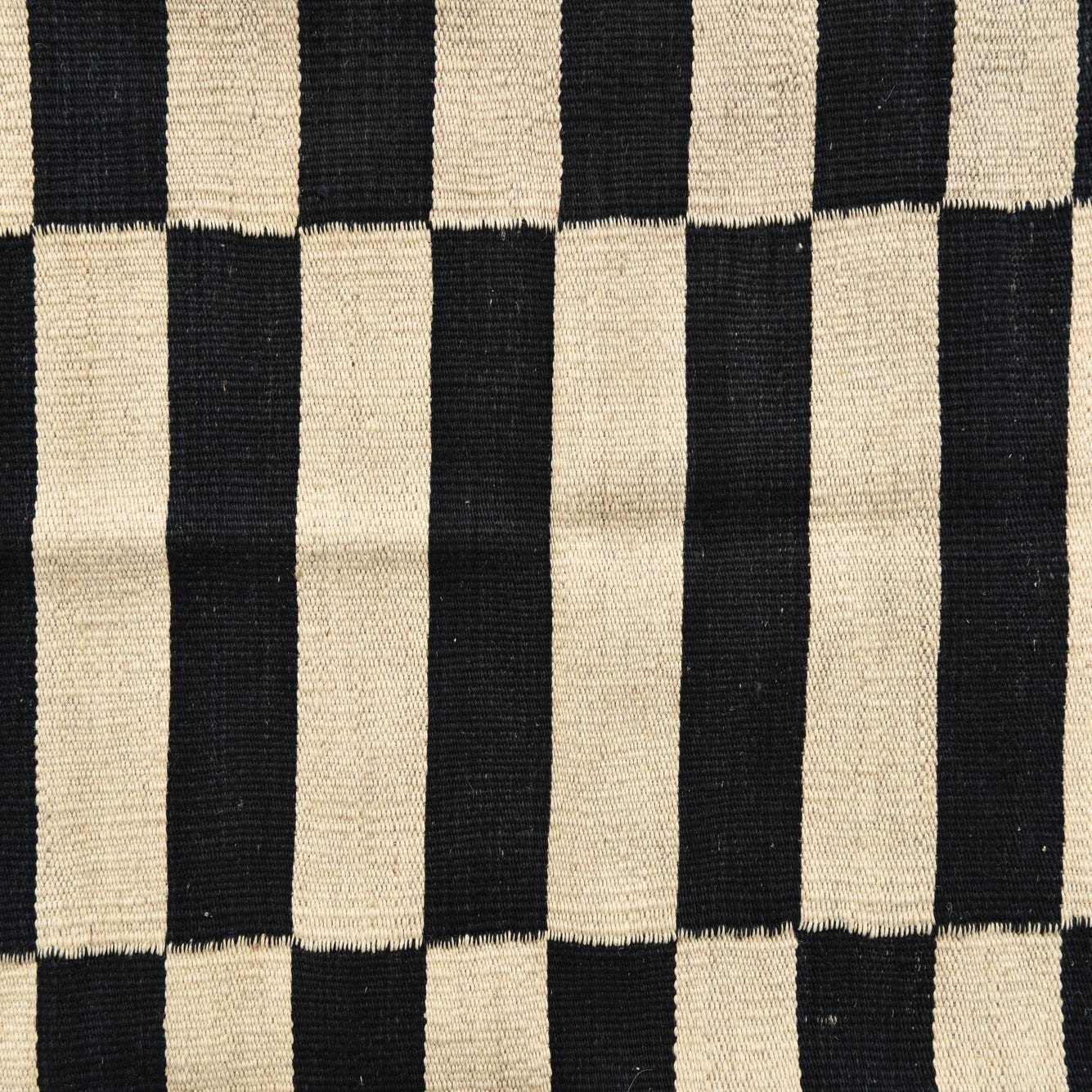 A bold geometric field of alternating black and white bands forms three vertical columns of stacked blocks, giving the rug a modern, structured look. The flat-woven Kilim construction produces a low-profile, tactile surface with a firm, slightly coarse hand—you can feel the woolen weave under your fingertips while the natural fibers retain a soft warmth. Hand woven of 100% wool, the high-contrast palette anchors a space and the stripe-to-block motif brings a clean, graphic energy.