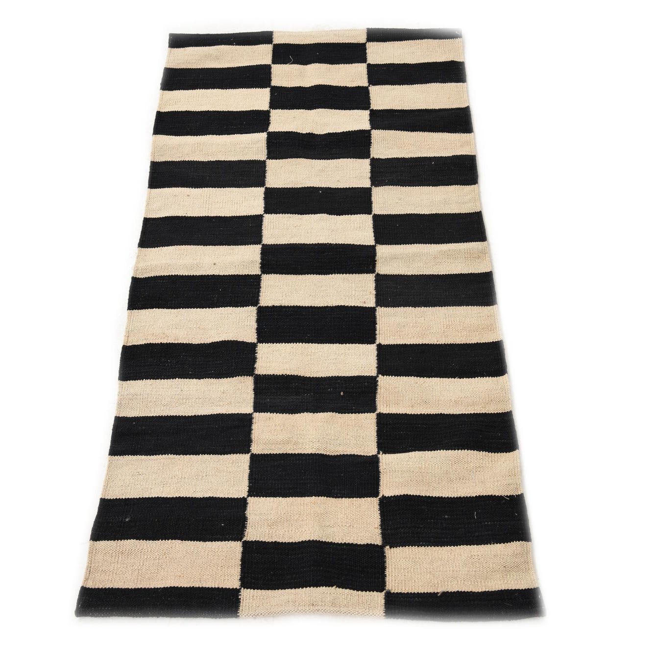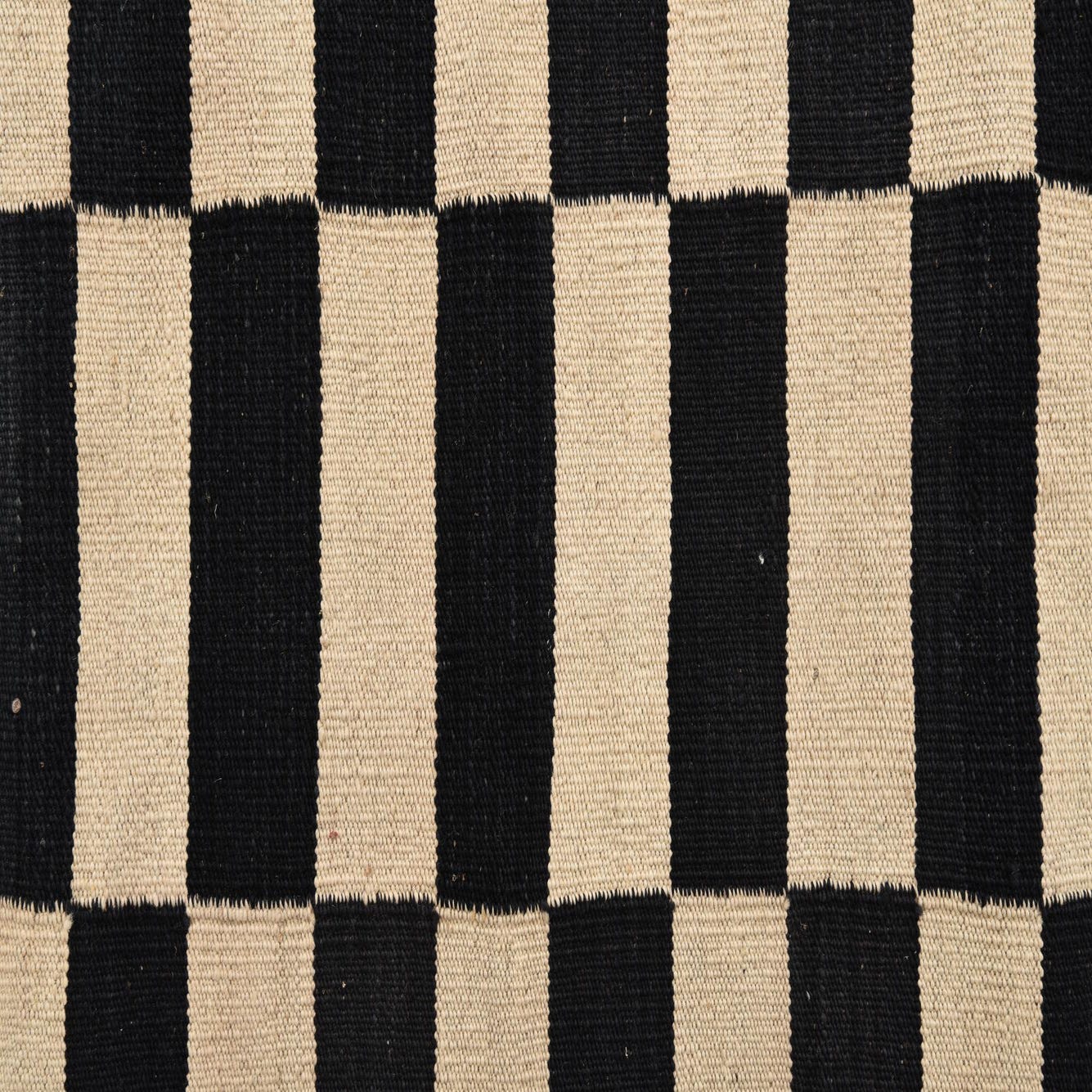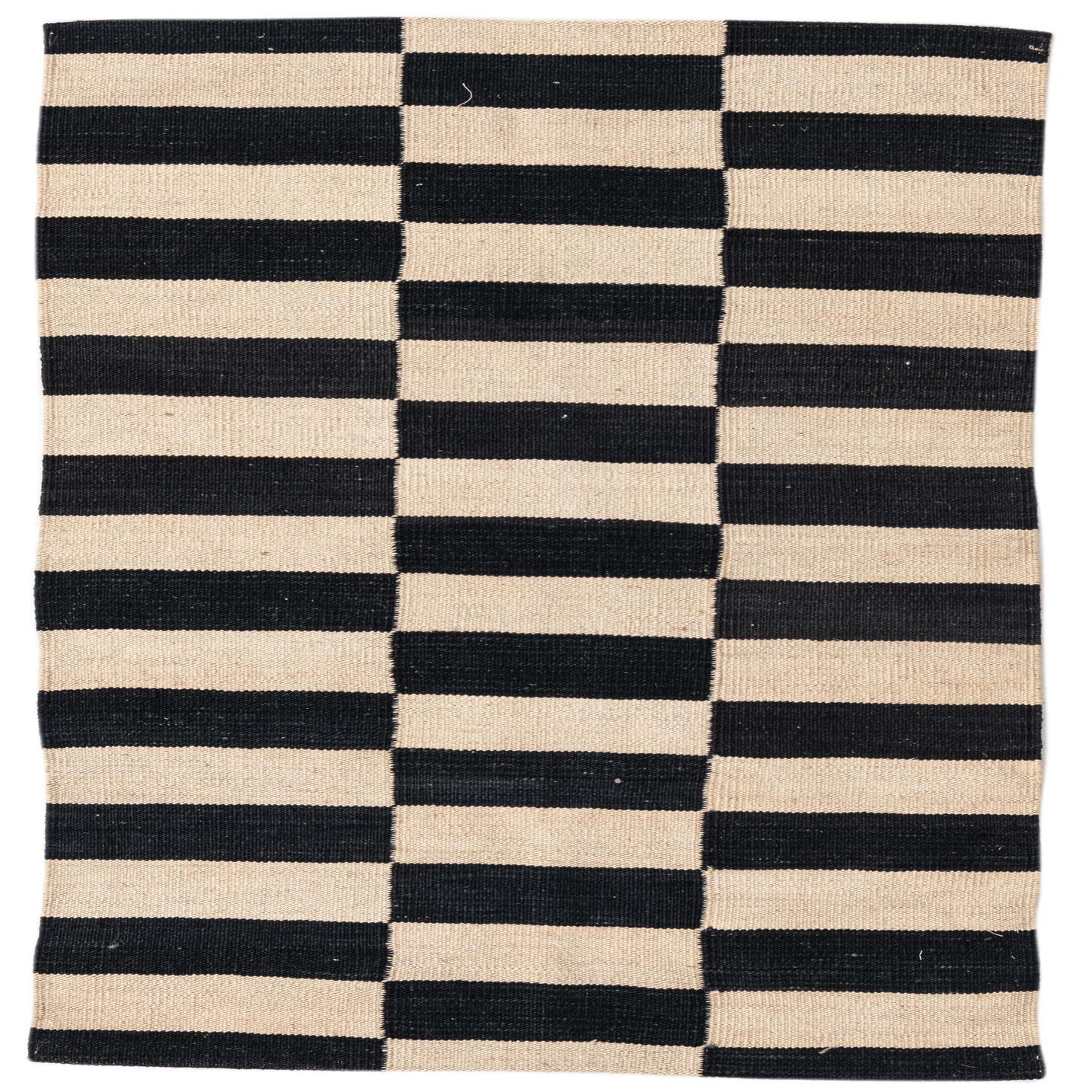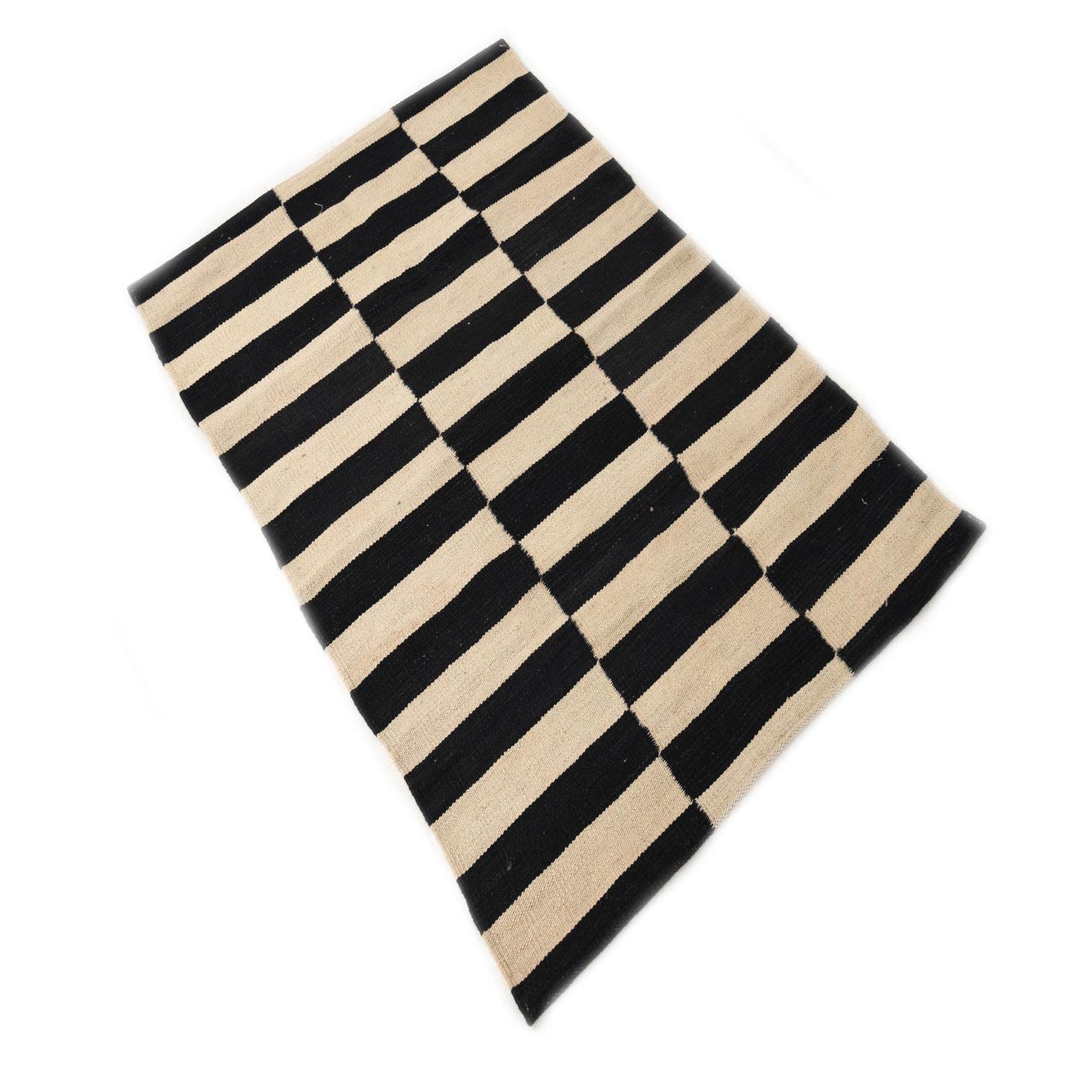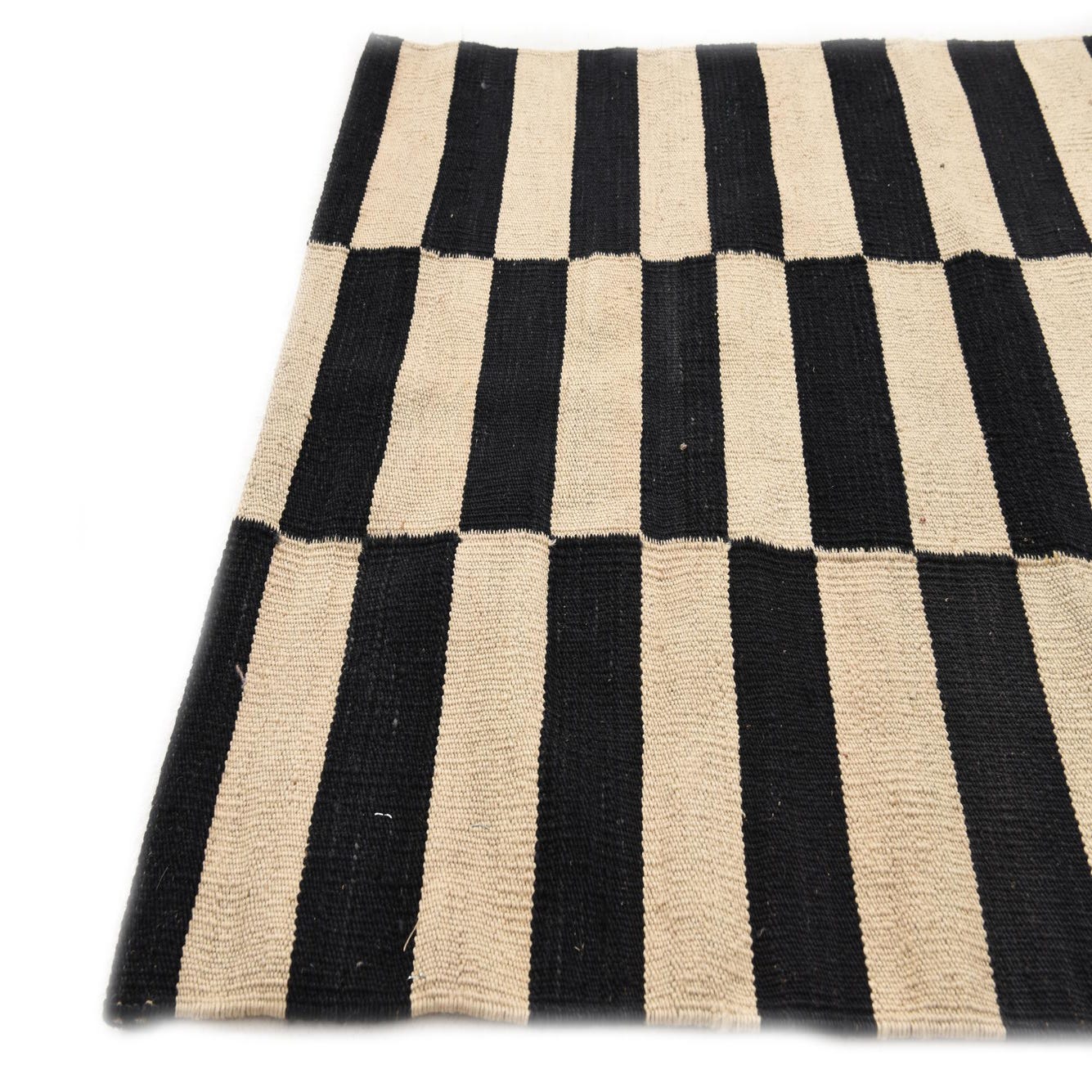 A 3x4 rectangular flatweave rug with a bold black and ivory striped pattern, perfect for a modern or tribal aesthetic.