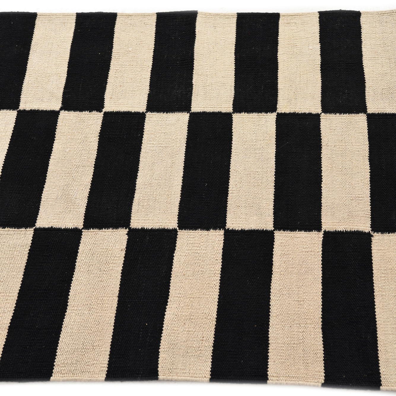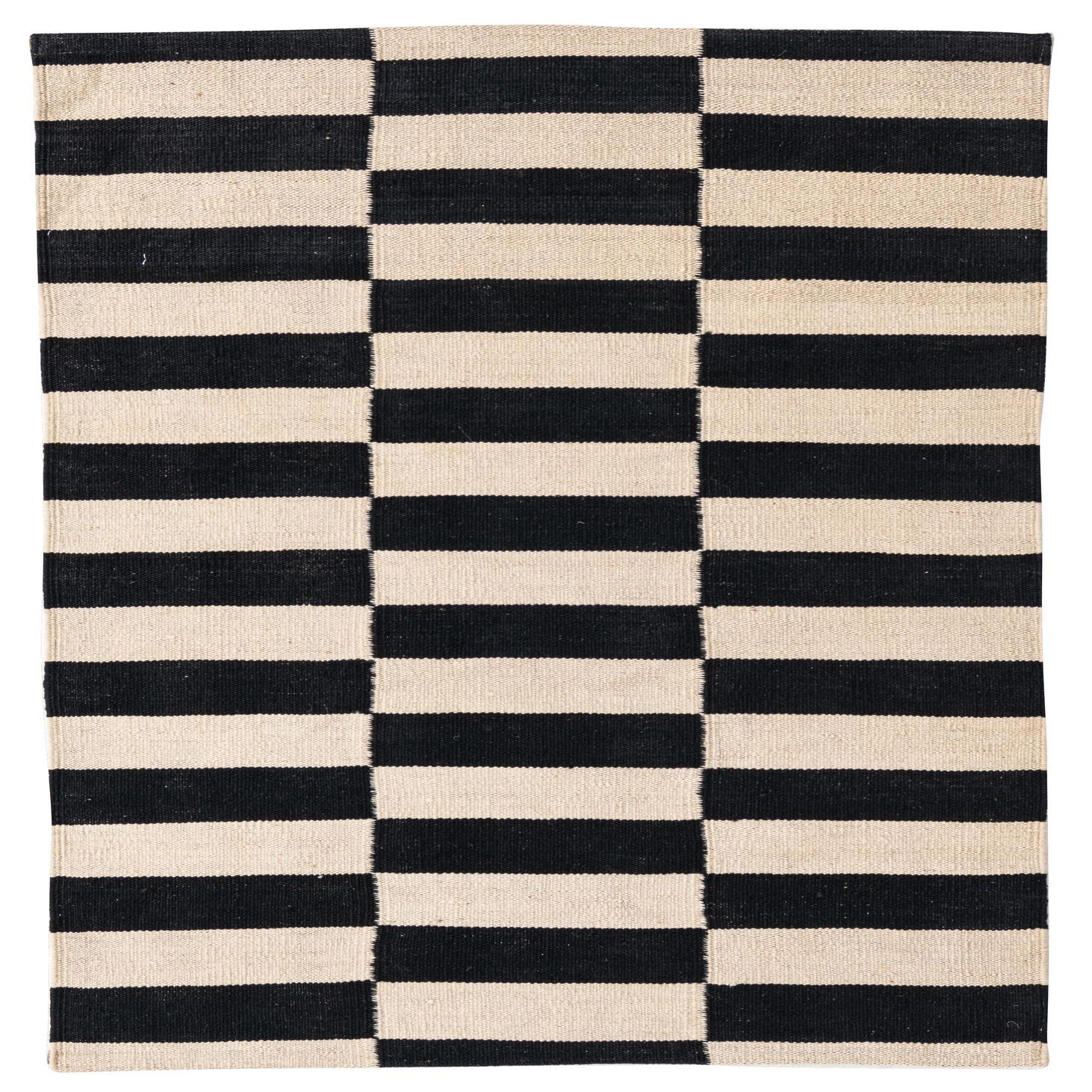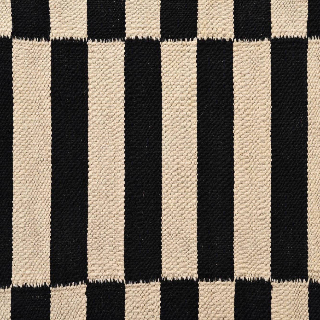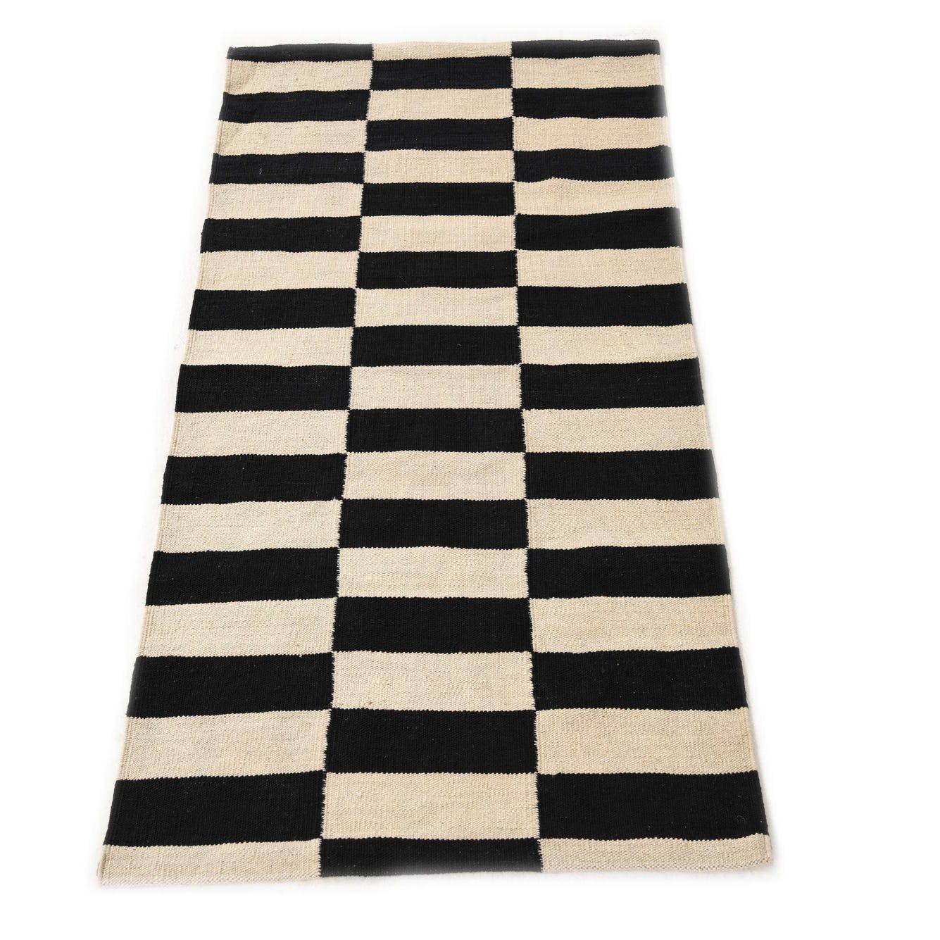 A 3x4 rectangular flatweave rug featuring a bold black and ivory striped pattern, perfect for a modern or tribal decor.