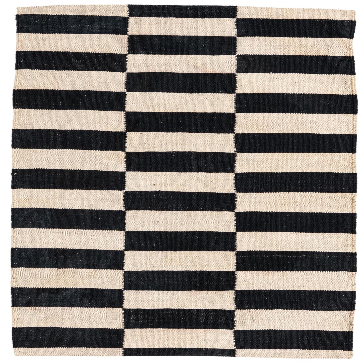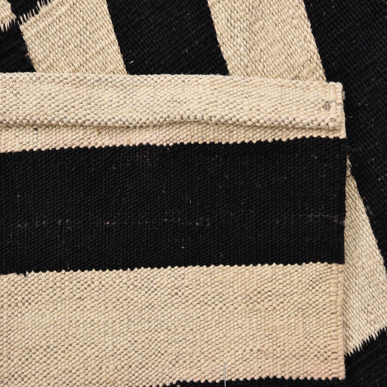 A 3x4 rectangular black and ivory flatweave wool rug with a bold, alternating horizontal stripe pattern.