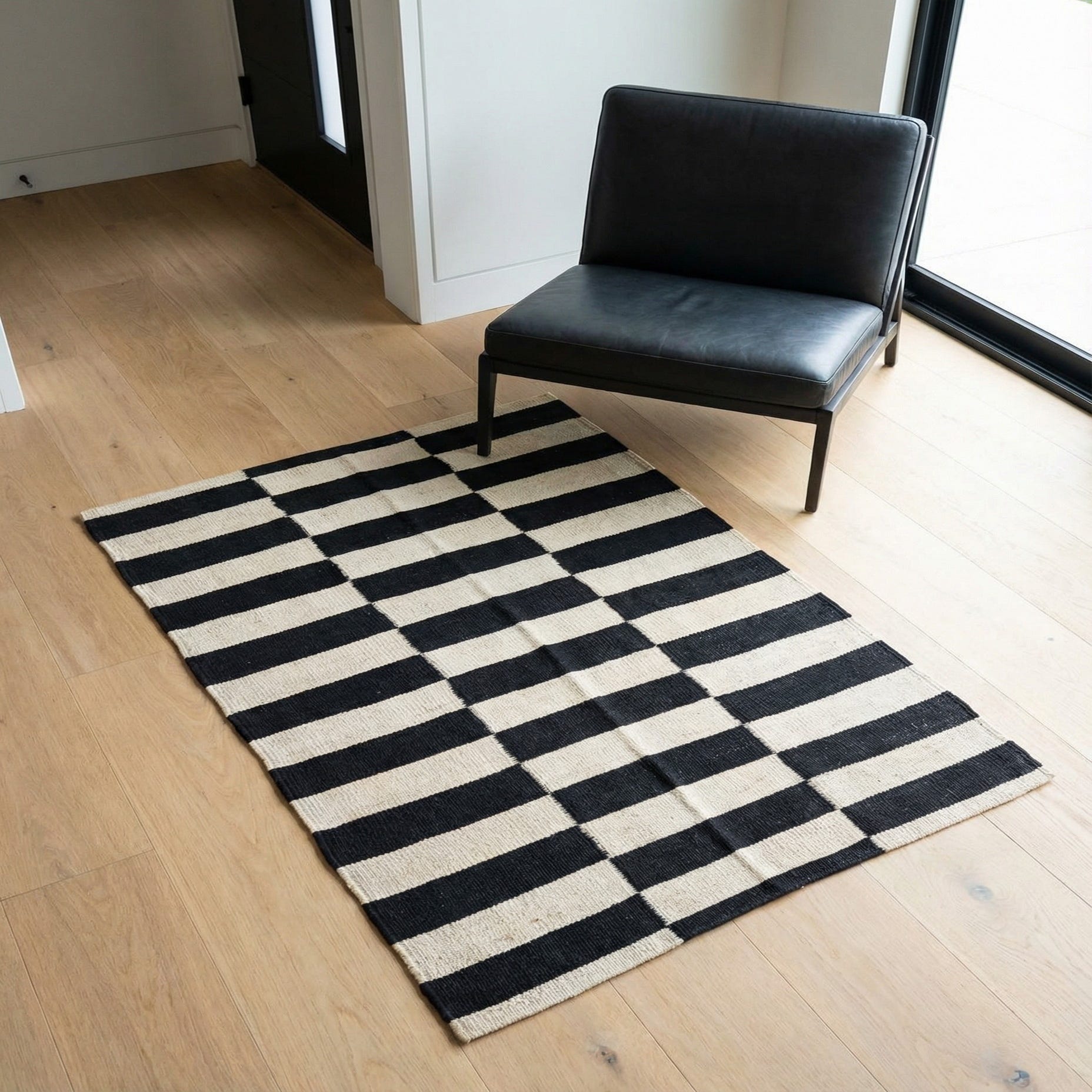This rug could serve as a statement piece in a minimalist setting where the contrast can truly pop or blend seamlessly in a monochromatic space that plays with textures. Its size makes it particularly suitable for entryways, home offices, or as an accent in living rooms looking to add a touch of modern simplicity.