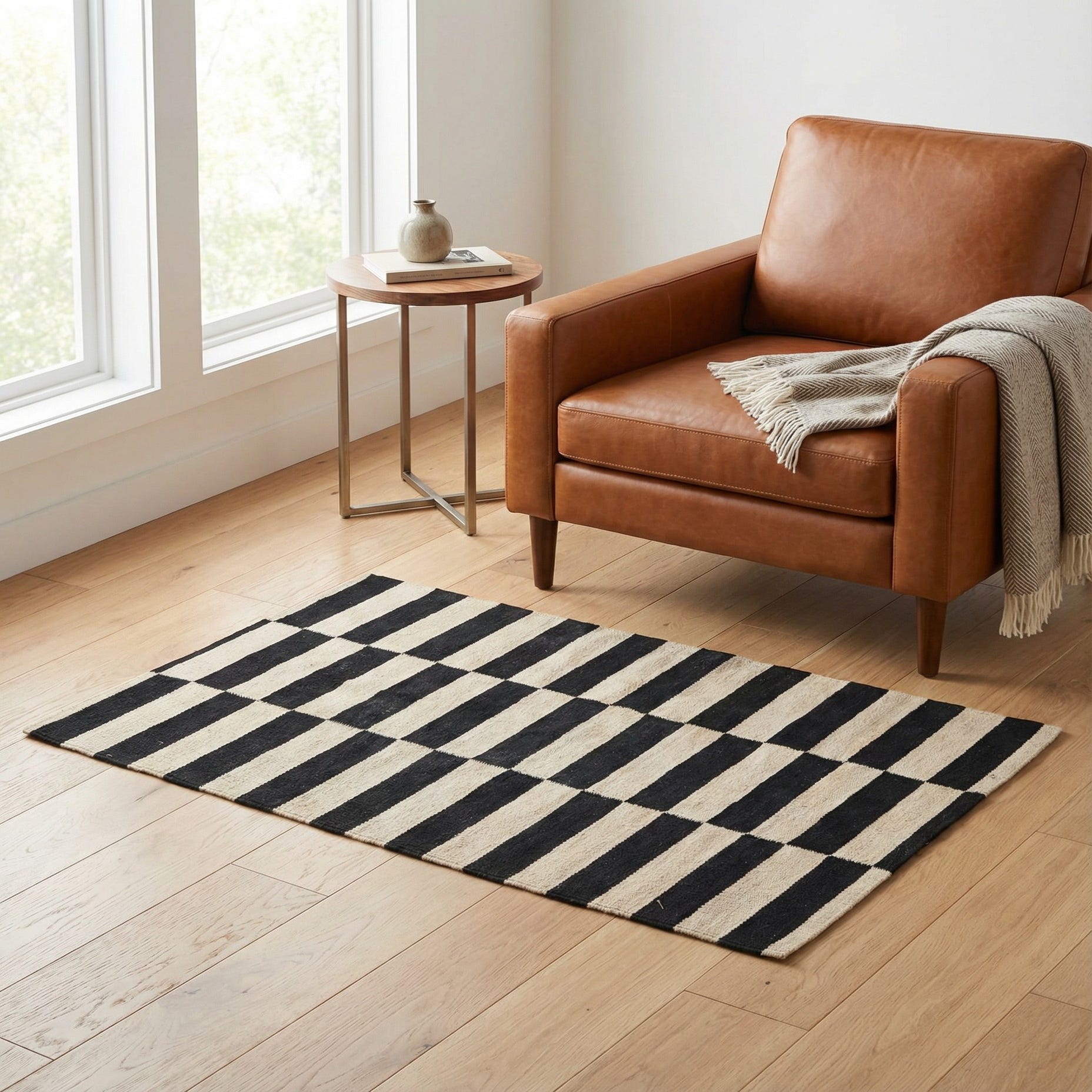 Due to its monochrome palette, this rug is versatile and can integrate seamlessly into an array of decorating styles. It can serve as a statement piece within a minimalist aesthetic, anchoring the space with its crisp lines. Conversely, in an eclectic or bohemian setting, the rug can harmonize disparate elements, providing a grounding effect amidst a mix of patterns and colors. This rug's graphic nature makes it suitable for use in a modern office, a chic living space, or even a warmly accented bedroom.