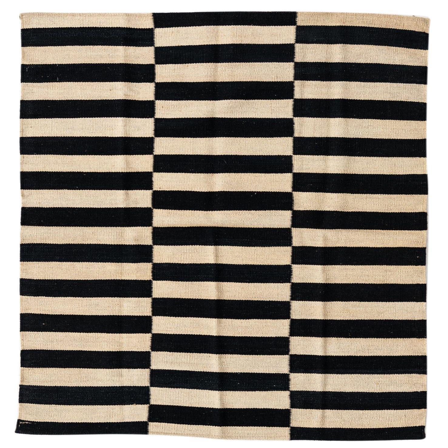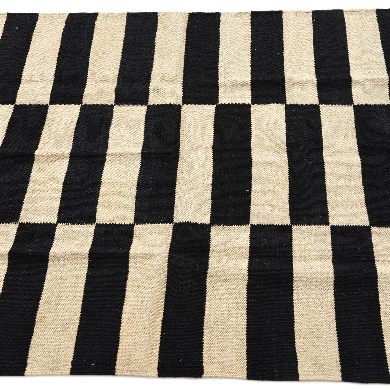 A 3x5 rectangular black and cream flatweave wool rug featuring a bold, modern striped pattern, ideal for an entryway or kitchen.