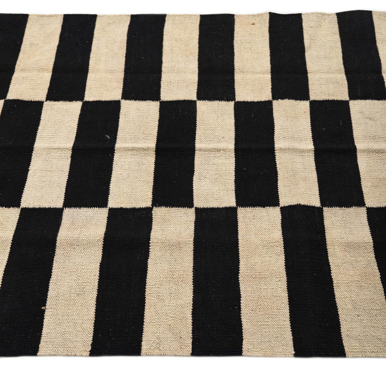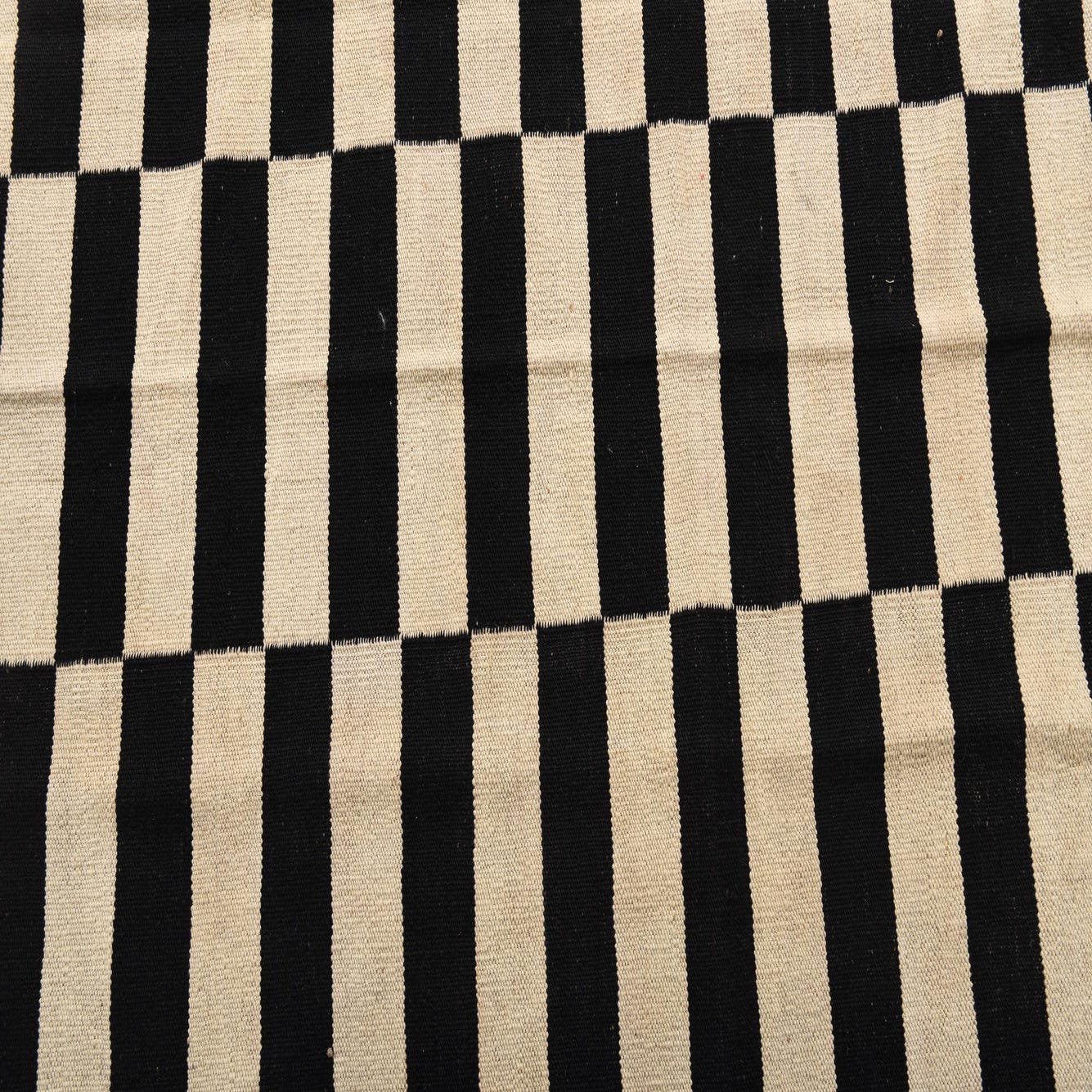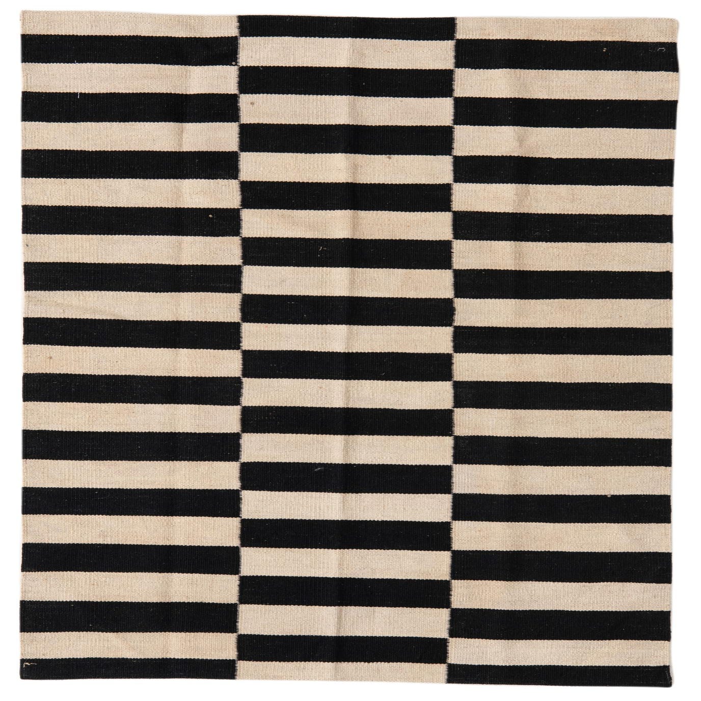 Bold black-and-white geometry in a clean, contemporary stripe layout gives this flatweave a strong graphic presence. Alternating horizontal bands are arranged into three vertical panels, producing a steady, rhythmic pattern that feels both modern and timeless. Hand-woven of 100% wool, the rug has a low-profile, tactile surface — you can feel the dense, even weave underfoot and the natural warmth of wool fibers with the slight texture only handcrafting provides.
