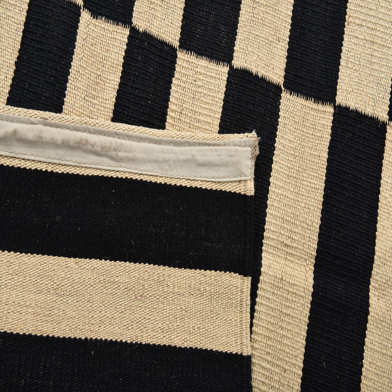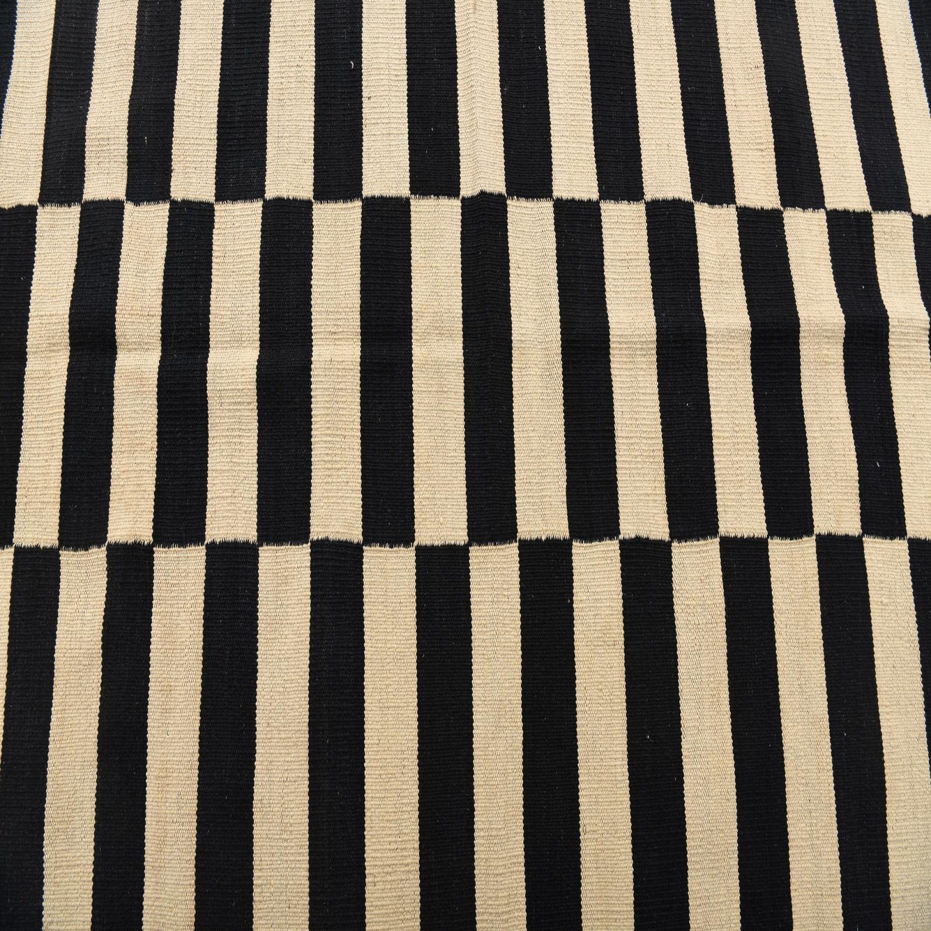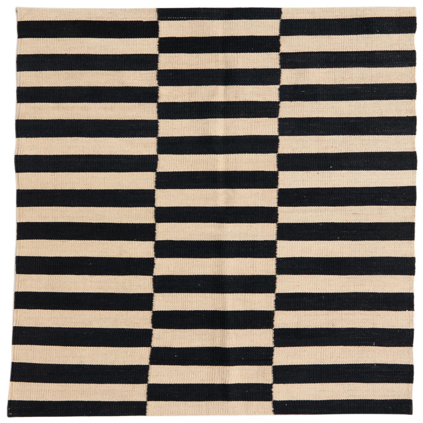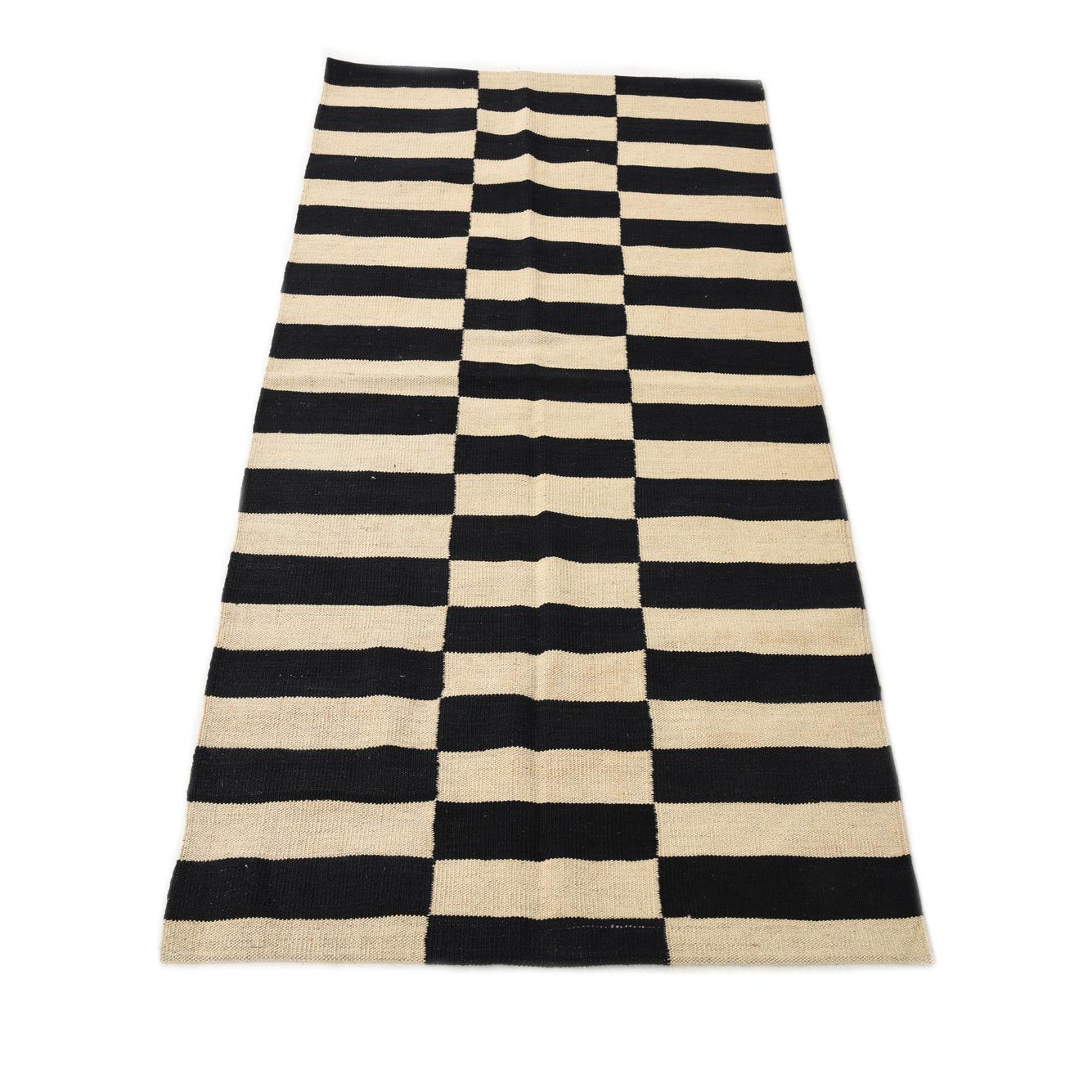 A 3x5 rectangular black and ivory flatweave wool rug with a modern tribal striped pattern, ideal for an entryway.