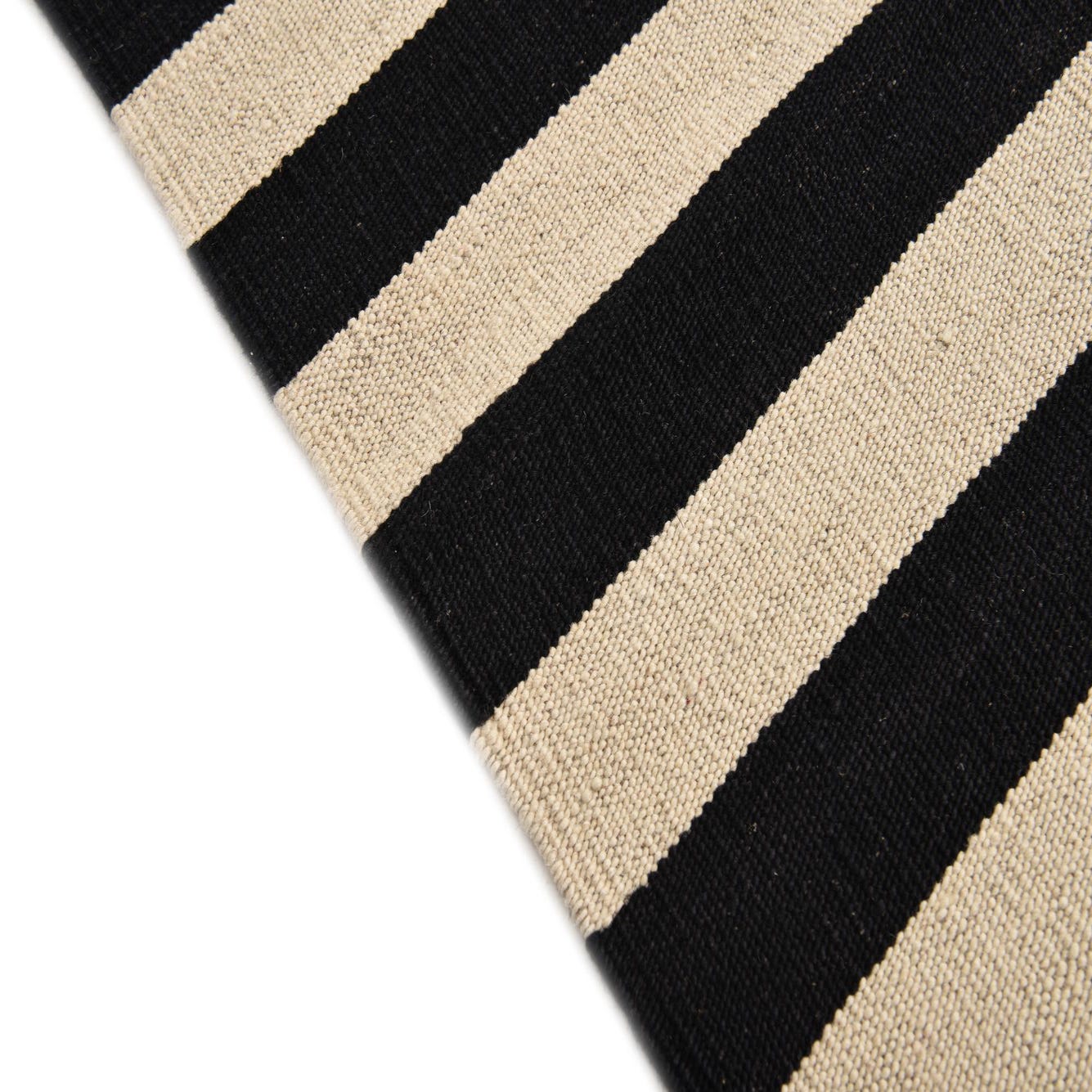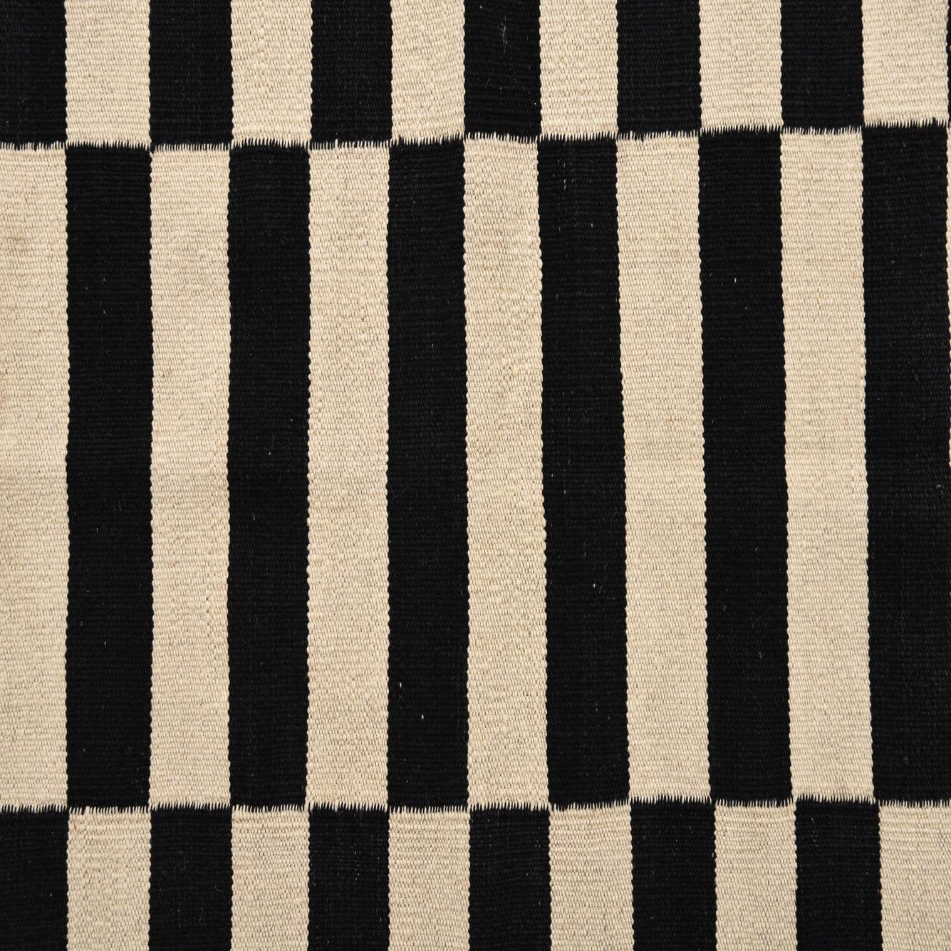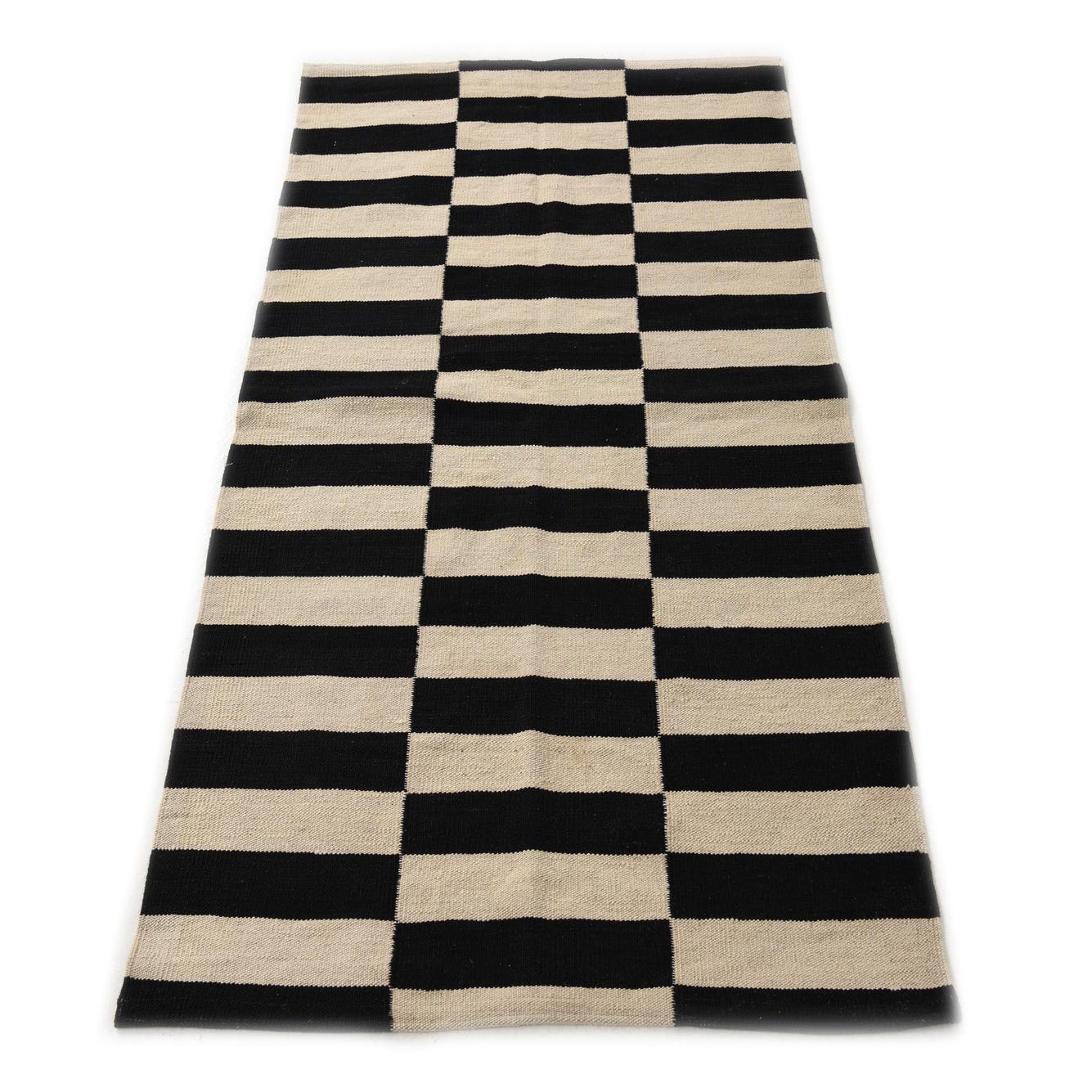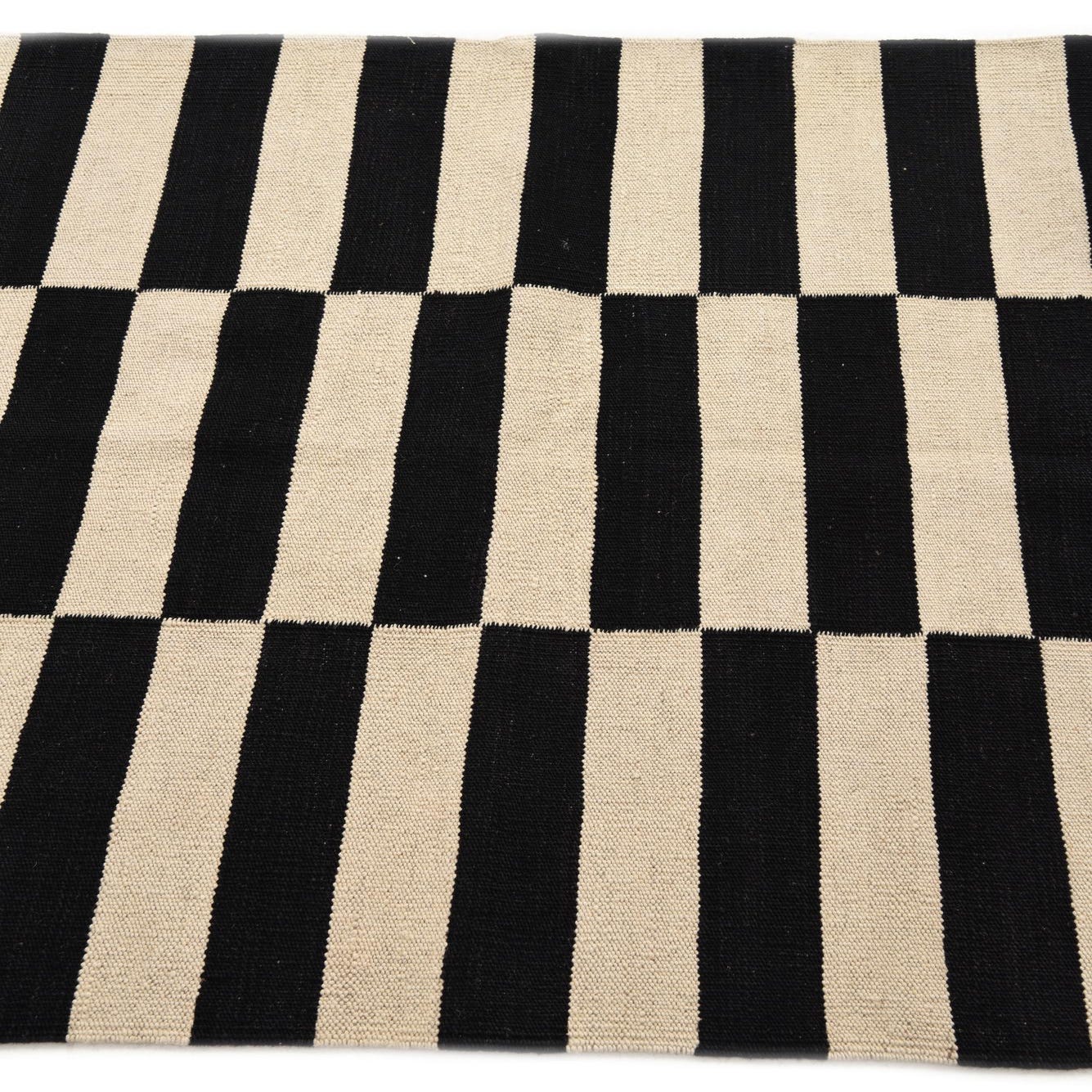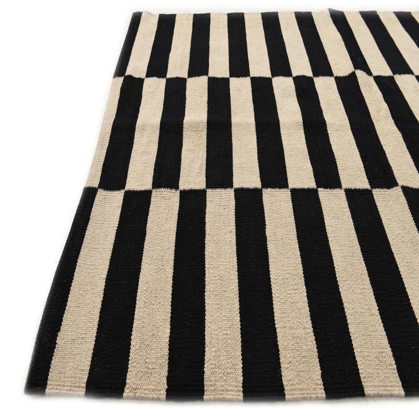 A bold, graphic stripe pattern plays out across three vertical panels, with alternating black and white bands that create a rhythmic, almost checkerboard effect. The flatweave construction is hand woven from 100% wool, giving the surface a low, dense profile with a firm, tactile hand and subtle irregularities that show the craft of the weave. The high-contrast palette and geometric layout deliver a modern, pared-back look that anchors a space without extra texture or pile.