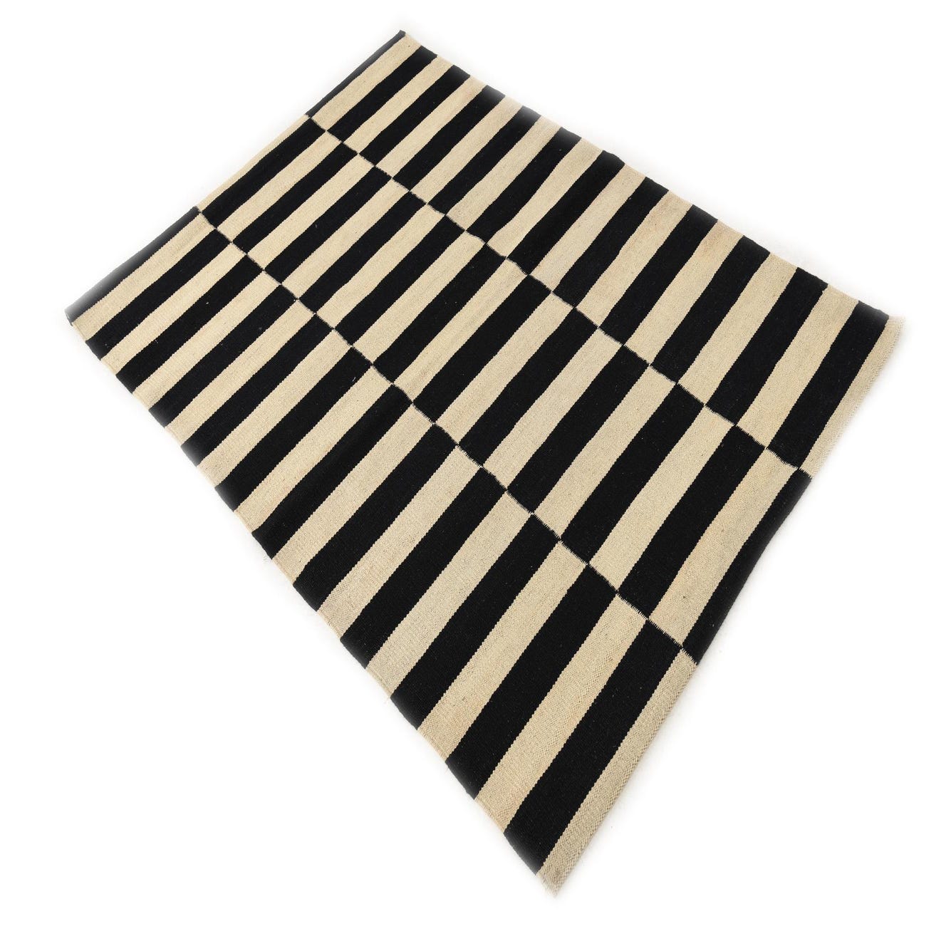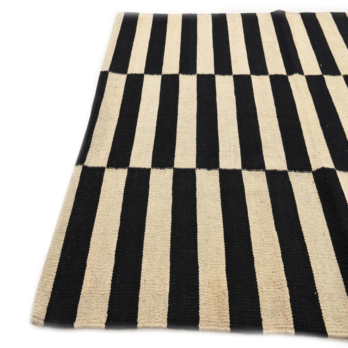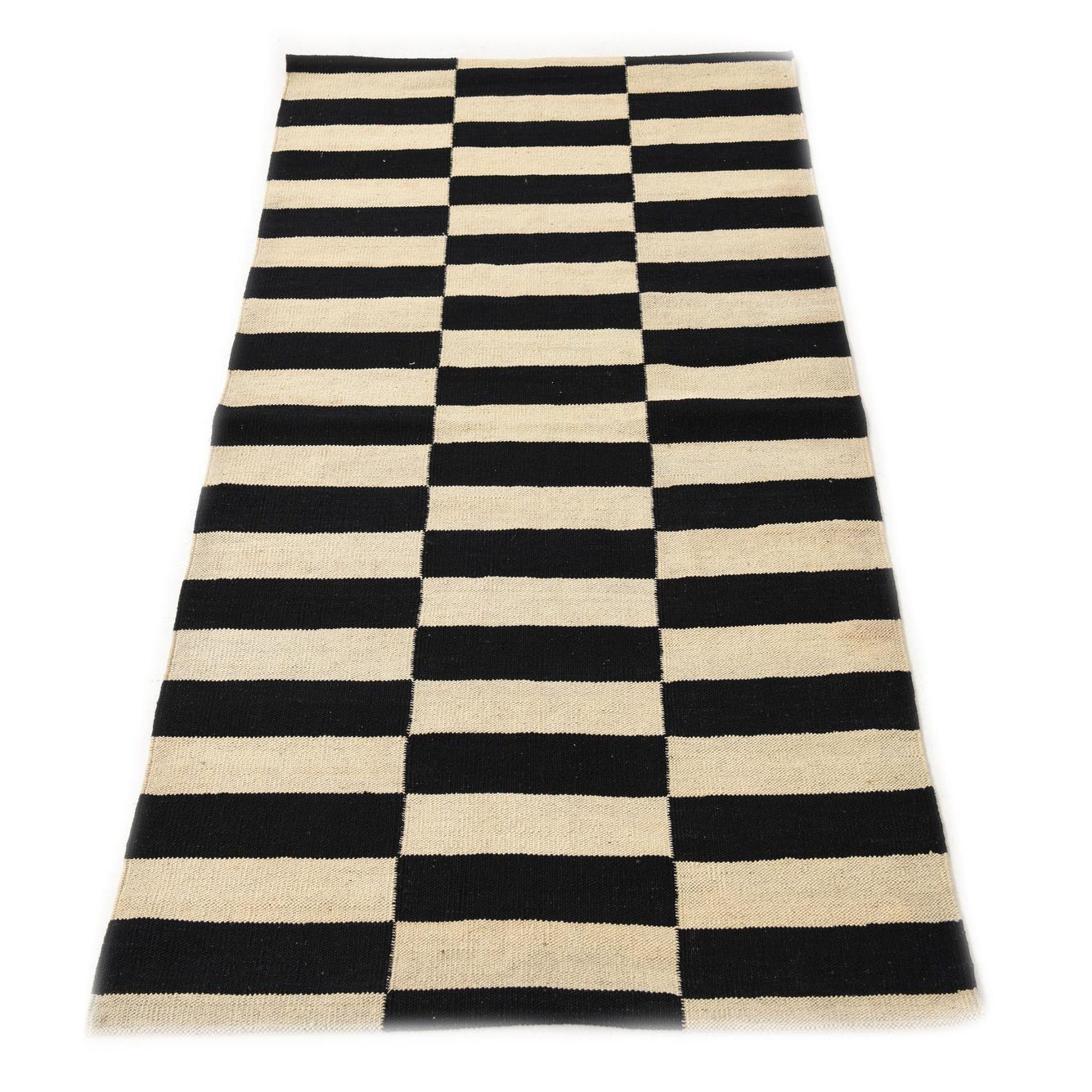 A 3x5 rectangular black and ivory flatweave wool rug with a modern tribal stripe pattern.