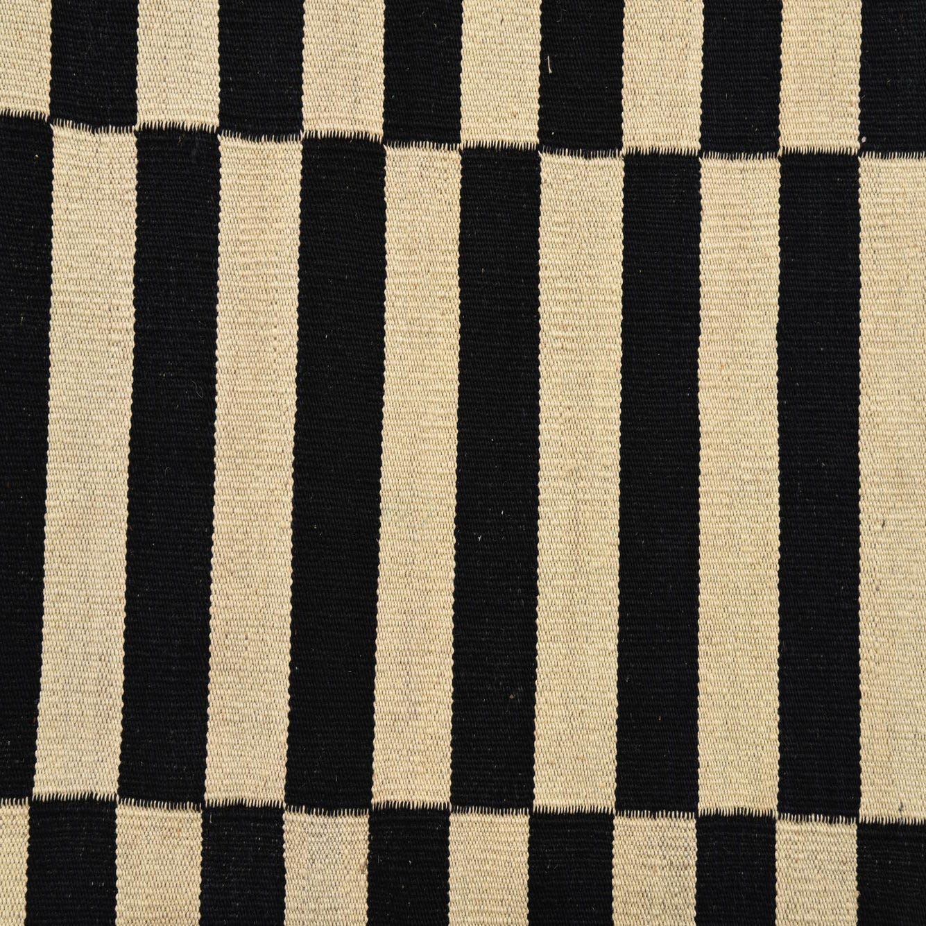 From the Kilim Modern collection, this hand-woven 3x5 rug is crafted from 100% wool, offering both durability and comfort underfoot. The rug showcases a bold striped pattern, alternating in black and white, which provides a contemporary and minimalist aesthetic. The crisp linear design creates a sense of structure and can seamlessly integrate into a variety of interior styles, from Scandinavian-inspired spaces to more eclectic and modern environments. The contrast in color is visually striking, yet the palette is versatile enough to complement numerous color schemes within a residential or professional setting. This piece would be particularly fitting in an area where a graphic statement is desired without overwhelming the space, such as a home office, entryway, or as a dynamic accent in a living room.