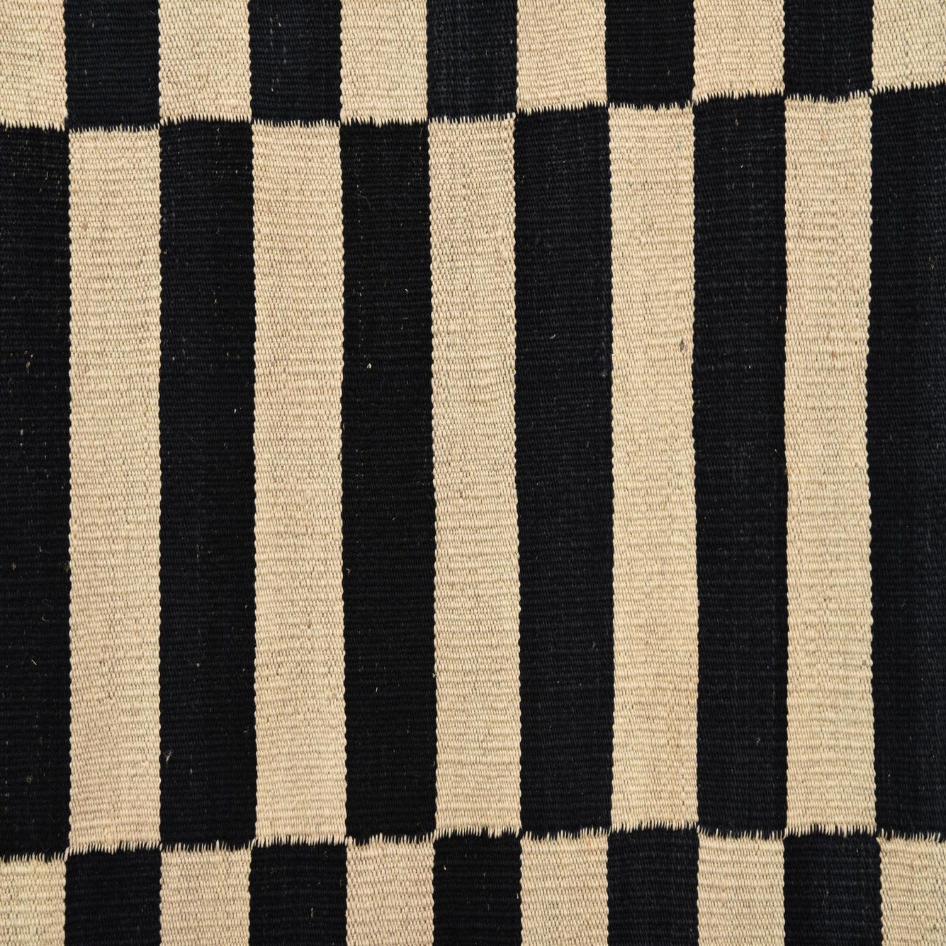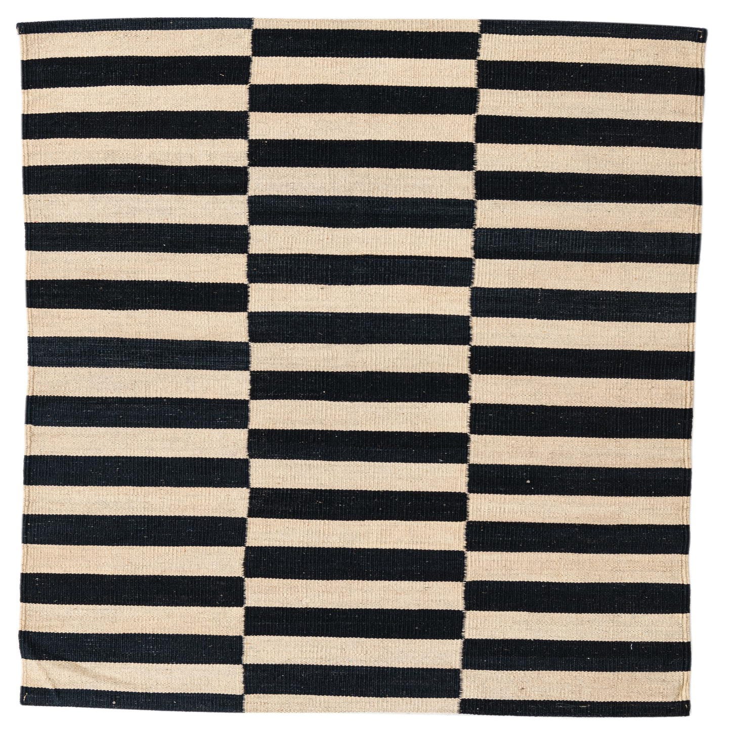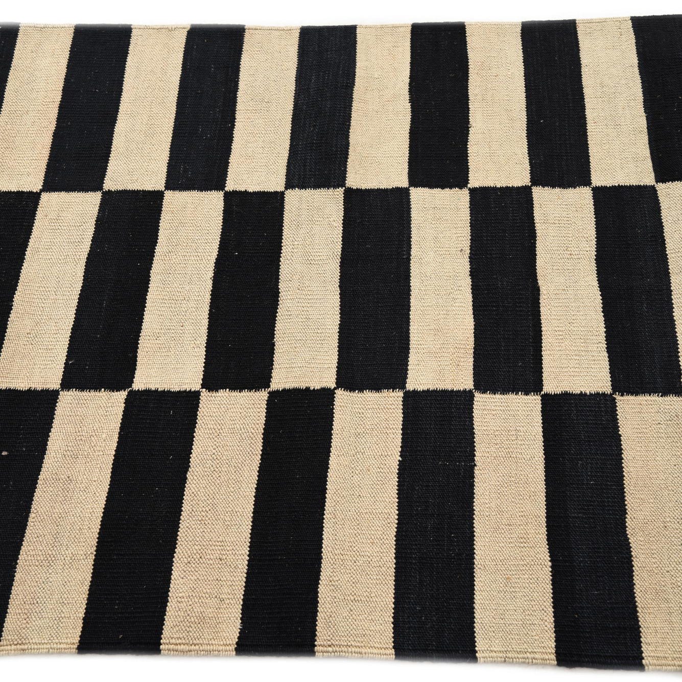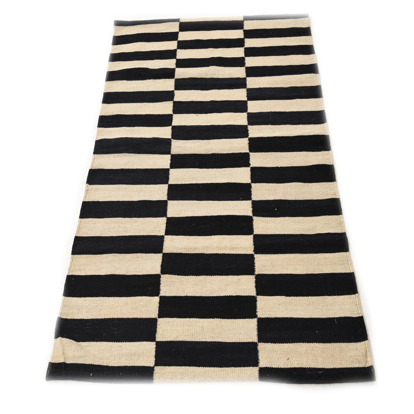 A 3x5 rectangular black and ivory flatweave wool rug with a modern tribal stripe pattern.