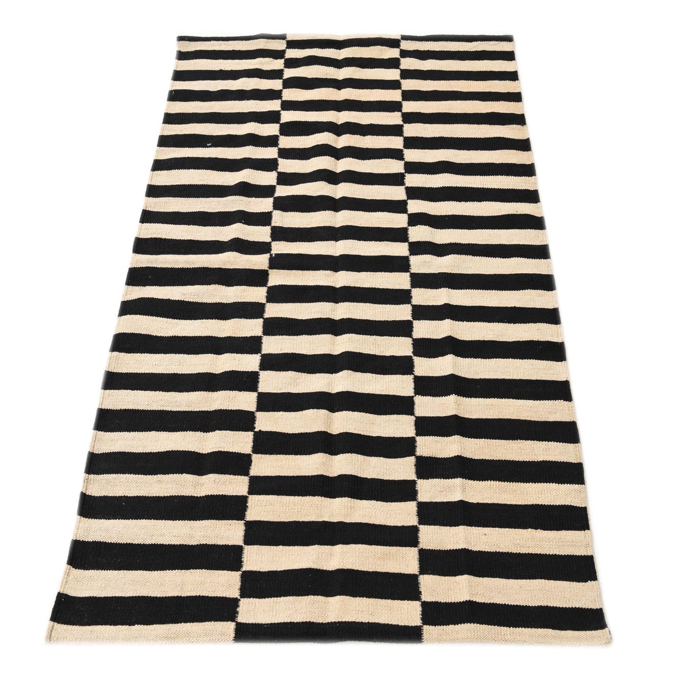 A 3x5 rectangular Kilim Modern rug with a bold black and ivory striped pattern, ideal for a modern living room.